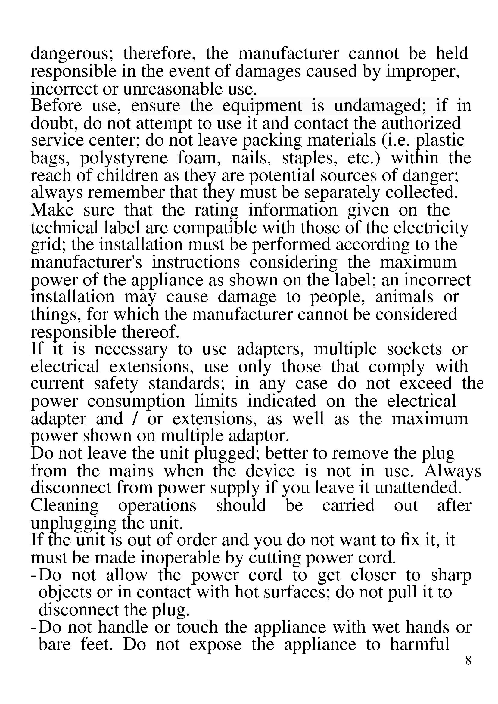 The following are important notes on the installation, use and maintenance; save this instruction manual for future reference; use the equipment only as specified in this guide; any other use is considered improper and8 dangerous; therefore, the manufacturer cannot be held responsible in the event of damages caused by improper, incorrect or unreasonable use. Before use, ensure the equipment is undamaged; if in doubt, do not attempt to use it and contact the authorized service center; do not leave packing materials (i.e. plastic bags, polystyrene foam, nails, staples, etc.) within the reach of children as they are potential sources of danger; always remember that they must be separately collected. Make sure that the rating information given on the technical label are compatible with those of the electricity grid; the installation must be performed according to the manufacturer's instructions considering the maximum power of the appliance as shown on the label; an incorrect installation may cause damage to people, animals or things, for which the manufacturer cannot be considered responsible thereof. If it is necessary to use adapters, multiple sockets or electrical extensions, use only those that comply with current safety standards; in any case do not exceed the power consumption limits indicated on the electrical adapter and / or extensions, as well as the maximum power shown on multiple adaptor. Do not leave the unit plugged; better to remove the plug from the mains when the device is not in use. Always disconnect from power supply if you leave it unattended. Cleaning operations should be carried out after unplugging the unit. If the unit is out of order and you do not want to fix it, it must be made inoperable by cutting power cord. - Do not allow the power cord to get closer to sharp objects or in contact with hot surfaces; do not pull it to disconnect the plug. - Do not handle or touch the appliance with wet hands or bare feet. Do not expose the appliance to harmful9 weather conditions such as rain, moisture, frost, etc.. Always store it in a dry place. - Do not use the appliance in the event of damage to the power cord, plug, or in case of short circuits; to repair the product only address an authorized service center. - This appliance can be used by children of 8 years and above and persons with reduced physical, sensory or mental capabilities or lack of experience and knowledge if they received supervision or instruction concerning use of the appliance in a safe way and understand hazards involved; children shall not play with the appliance; cleaning and user maintenance shall not be made by children without supervision. - Children must not play with the appliance. - Keep the appliance and its cord out of reach of children less than 8 years. If the power cord is damaged, or in case of failure and / or malfunction do not tamper with the unit. The reparation must be done by manufacturer or by service center authorized by the manufacturer in order to prevent any risk. Failure to comply with the above may compromise the unit safety and invalidate the warranty.