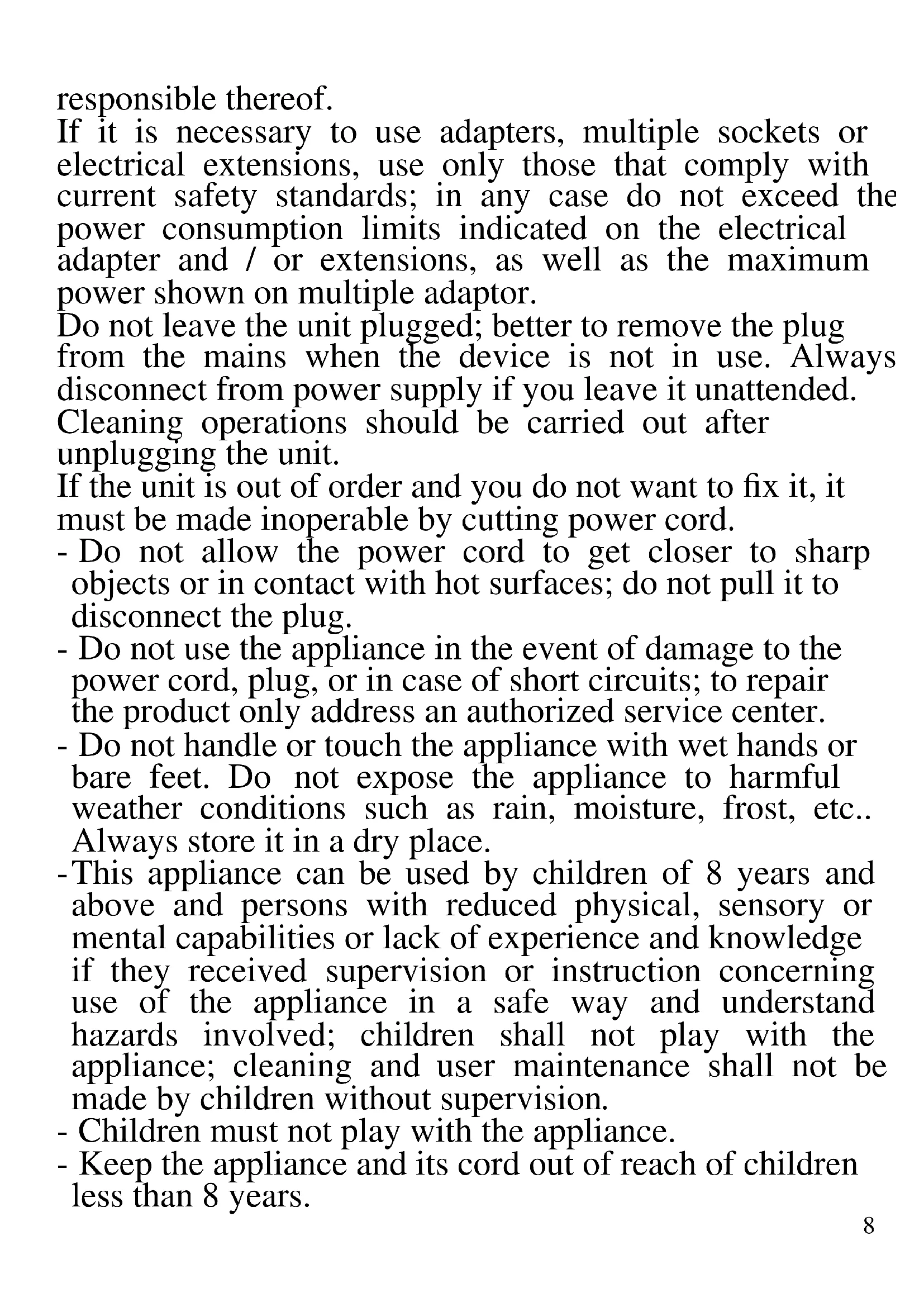 The following are important notes on the installation, use and maintenance; save this instruction manual for future reference; use the equipment only as specified in this guide; any other use is considered improper and dangerous; therefore, the manufacturer cannot be held responsible in the event of damages caused by improper, incorrect or unreasonable use. Before use, ensure the equipment is undamaged; if in doubt, do not attempt to use it and contact the authorized service center; do not leave packing materials (i.e. plastic bags, polystyrene foam, nails, staples, etc.) within the reach of children as they are potential sources of danger; always remember that they must be separately collected. Make sure that the rating information given on the technical label are compatible with those of the electricity grid; the installation must be performed according to the manufacturer's instructions considering the maximum power of the appliance as shown on the label; an incorrect installation may cause damage to people, animals or things, for which the manufacturer cannot be considered8 responsible thereof. If it is necessary to use adapters, multiple sockets or electrical extensions, use only those that comply with current safety standards; in any case do not exceed the power consumption limits indicated on the electrical adapter and / or extensions, as well as the maximum power shown on multiple adaptor. Do not leave the unit plugged; better to remove the plug from the mains when the device is not in use. Always disconnect from power supply if you leave it unattended. Cleaning operations should be carried out after unplugging the unit. If the unit is out of order and you do not want to fix it, it must be made inoperable by cutting power cord. - Do not allow the power cord to get closer to sharp objects or in contact with hot surfaces; do not pull it to disconnect the plug. - Do not use the appliance in the event of damage to the power cord, plug, or in case of short circuits; to repair the product only address an authorized service center. - Do not handle or touch the appliance with wet hands or bare feet. Do not expose the appliance to harmful weather conditions such as rain, moisture, frost, etc.. Always store it in a dry place. - This appliance can be used by children of 8 years and above and persons with reduced physical, sensory or mental capabilities or lack of experience and knowledge if they received supervision or instruction concerning use of the appliance in a safe way and understand hazards involved; children shall not play with the appliance; cleaning and user maintenance shall not be made by children without supervision. - Children must not play with the appliance. - Keep the appliance and its cord out of reach of children less than 8 years.9 If the power cord is damaged, or in case of failure and / or malfunction do not tamper with the unit. The reparation must be done by manufacturer or by service center authorized by the manufacturer in order to prevent any risk. Failure to comply with the above may compromise the unit safety and invalidate the warranty.