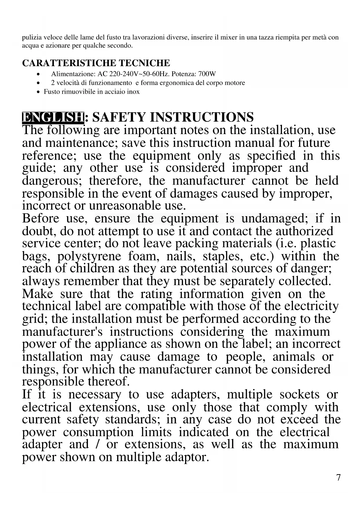 The unit features two working speeds (2 and 3 button). For best results and to avoid overheating, it is recommended to use the unit for short and regular intervals, then for a long time, always making circular movements inside the container of food. It is also recommended to start processing food from the first speed, ending up using the faster speed. CLEANING - Unplug the unit from the electrical outlet. Do not immerse the motor body in water or other liquids, but wash it with a damp cloth and non-abrasive detergent. Avoid any infiltration of water inside the motor housing. Shaft, blades and accessories can be washed like normal dishes, with a non-abrasive sponge and mild detergent. Dry them thoroughly before assembling them to the main body. For a quick cleaning of the blades of the shaft during different processes, insert the hand blender into a cup filled with water and operate for a few seconds. TECHNICAL FEATURES