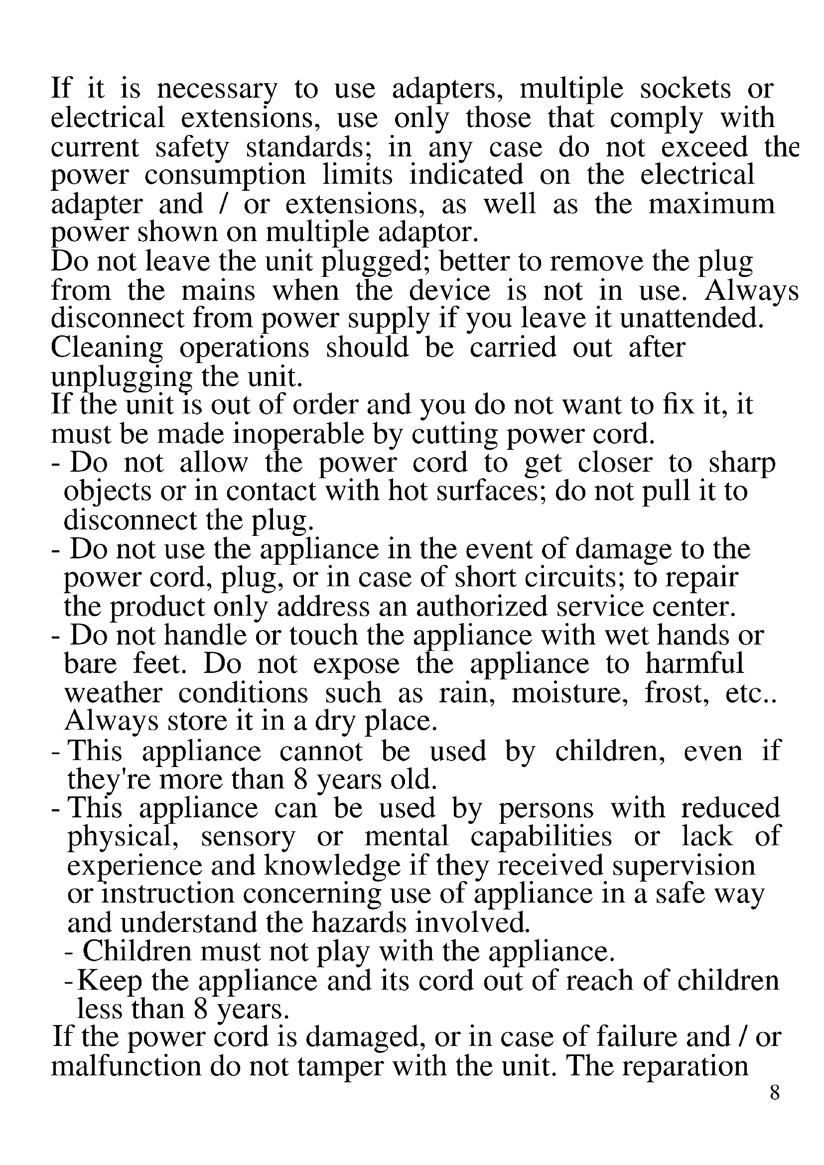 The following are important notes on the installation, use and maintenance; save this instruction manual for future reference; use the equipment only as specified in this guide; any other use is considered improper and dangerous; therefore, the manufacturer cannot be held responsible in the event of damages caused by improper, incorrect or unreasonable use. Before use, ensure the equipment is undamaged; if in doubt, do not attempt to use it and contact the authorized service center; do not leave packing materials (i.e. plastic bags, polystyrene foam, nails, staples, etc.) within the reach of children as they are potential sources of danger; always remember that they must be separately collected. Make sure that the rating information given on the technical label are compatible with those of the electricity grid; the installation must be performed according to the manufacturer's instructions considering the maximum power of the appliance as shown on the label; an incorrect installation may cause damage to people, animals or things, for which the manufacturer cannot be considered responsible thereof.8 If it is necessary to use adapters, multiple sockets or electrical extensions, use only those that comply with current safety standards; in any case do not exceed the power consumption limits indicated on the electrical adapter and / or extensions, as well as the maximum power shown on multiple adaptor. Do not leave the unit plugged; better to remove the plug from the mains when the device is not in use. Always disconnect from power supply if you leave it unattended. Cleaning operations should be carried out after unplugging the unit. If the unit is out of order and you do not want to fix it, it must be made inoperable by cutting power cord. - Do not allow the power cord to get closer to sharp objects or in contact with hot surfaces; do not pull it to disconnect the plug. - Do not use the appliance in the event of damage to the power cord, plug, or in case of short circuits; to repair the product only address an authorized service center. - Do not handle or touch the appliance with wet hands or bare feet. Do not expose the appliance to harmful weather conditions such as rain, moisture, frost, etc.. Always store it in a dry place. - This appliance cannot be used by children, even if they're more than 8 years old. - This appliance can be used by persons with reduced physical, sensory or mental capabilities or lack of experience and knowledge if they received supervision or instruction concerning use of appliance in a safe way and understand the hazards involved. - Children must not play with the appliance. - Keep the appliance and its cord out of reach of children less than 8 years. If the power cord is damaged, or in case of failure and / or malfunction do not tamper with the unit. The reparation9 must be done by manufacturer or by service center authorized by the manufacturer in order to prevent any risk. Failure to comply with the above may compromise the unit safety and invalidate the warranty. - This appliance is intended to be used in household and similar applications such as: staff kitchen areas in shops, offices and other working environments; by clients in hotels, motels and other residential type environments; farm houses, bed and breakfast type environments. - The appliance is not intended to be operated by means of an external timer or separate remote-control system. - Before every use, unroll the power cord. - Use original spare parts and accessories only. - Do not subject the product to strong impacts, serious damages may result. - Do not use near or under flammable materials (like curtains), heat, cold spots and steam. GENERAL INSTRUCTIONS - Before using the unit for the first time, carefully wash all the parts and accessories intended to come in touch with food, such as the container, lid, rostrum and blades. CAUTION: close the lid before start processing the food. Disconnect the power plug from the socket before touching any accessory, especially the blades. - Bring knob on "0" (OFF) position before inserting the plug in the socket. Do not insert too large pieces of food inside the container, especially hard foods. It is recommended to pre-chop food. - Never leave the appliance unattended while it is running. - Do not let appliance running continuously for more than 2 minutes, make at least 5 minutes rest. - Unplug the unit from the electrical outlet immediately after using and/or before touching any accessory, especially the blades. If some food stops the blades,10 before removing the food, unplug the device from the electrical outlet. - Do not process very hot food (maximum temperature 60 Celsius degree). Never exceed the maximum quantity indicated on the container. - At the end of the process, wait for the blade to stop before removing the food from the container. - -Once you finished using the unit, it is recommended to wrap the power cord so as to ensure a better cleaning and to avoid any risk of damage. - When processing fruits, it is recommended to remove the pit and peel. For a better cleaning, it is recommended using warm tap water and restricting the use of detergents. In this case, rinse thoroughly. - Do not immerse motor unit in water or other liquids; clean the motor housing with a damp cloth. Blades and rostrum are very sharp: be careful not to cut himself during cleaning or when removing the accessories. DESCRIPTION G20122