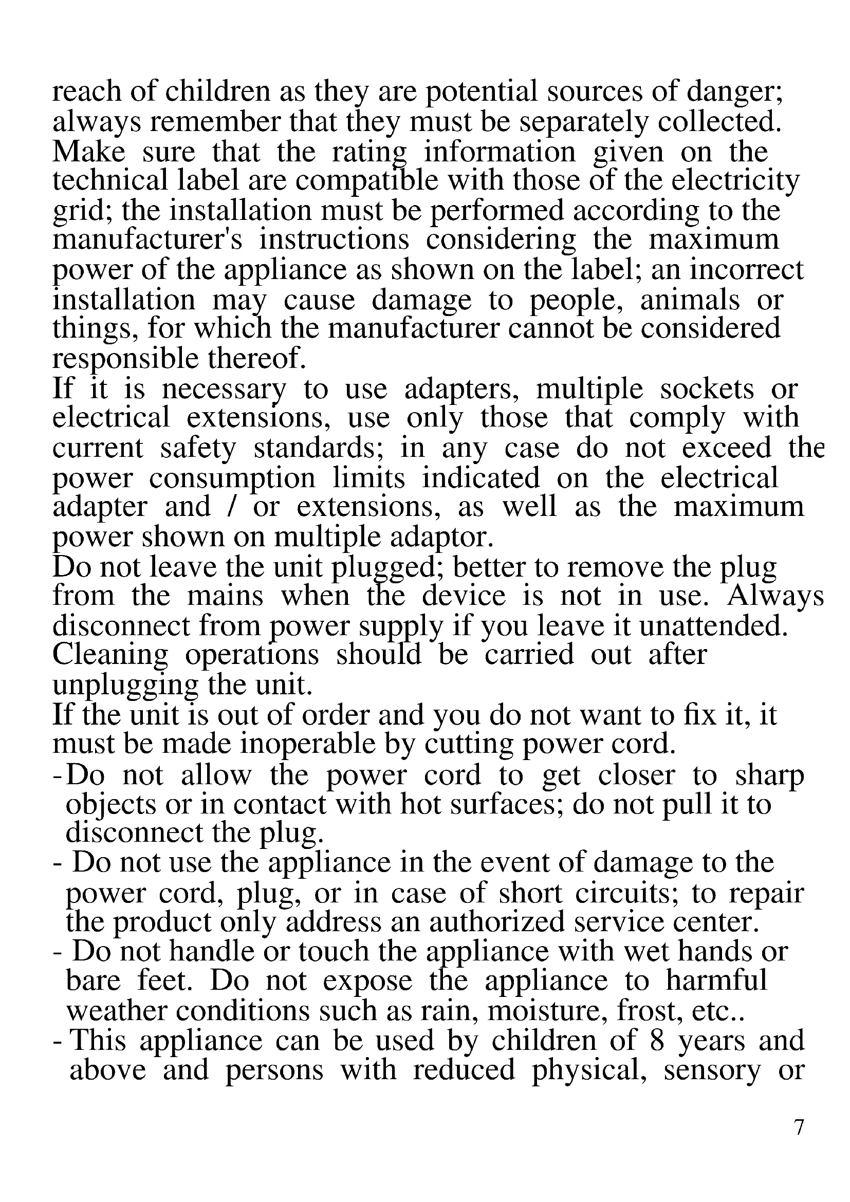 The following are important notes on the installation, use and maintenance; save this instruction manual for future reference; use the equipment only as specified in this guide; any other use is considered improper and dangerous; therefore, the manufacturer cannot be held responsible in the event of damages caused by improper, incorrect or unreasonable use. Before use, ensure the equipment is undamaged; if in doubt, do not attempt to use it and contact the authorized service center; do not leave packing materials (i.e. plastic bags, polystyrene foam, nails, staples, etc.) within the7 reach of children as they are potential sources of danger; always remember that they must be separately collected. Make sure that the rating information given on the technical label are compatible with those of the electricity grid; the installation must be performed according to the manufacturer's instructions considering the maximum power of the appliance as shown on the label; an incorrect installation may cause damage to people, animals or things, for which the manufacturer cannot be considered responsible thereof. If it is necessary to use adapters, multiple sockets or electrical extensions, use only those that comply with current safety standards; in any case do not exceed the power consumption limits indicated on the electrical adapter and / or extensions, as well as the maximum power shown on multiple adaptor. Do not leave the unit plugged; better to remove the plug from the mains when the device is not in use. Always disconnect from power supply if you leave it unattended. Cleaning operations should be carried out after unplugging the unit. If the unit is out of order and you do not want to fix it, it must be made inoperable by cutting power cord. - Do not allow the power cord to get closer to sharp objects or in contact with hot surfaces; do not pull it to disconnect the plug. - Do not use the appliance in the event of damage to the power cord, plug, or in case of short circuits; to repair the product only address an authorized service center. - Do not handle or touch the appliance with wet hands or bare feet. Do not expose the appliance to harmful weather conditions such as rain, moisture, frost, etc.. - This appliance can be used by children of 8 years and above and persons with reduced physical, sensory or8 mental capabilities or lack of experience and knowledge if they received supervision or instruction concerning use of the appliance in a safe way and understand hazards involved; children shall not play with the appliance; cleaning and user maintenance shall not be made by children without supervision. - Always store it in a dry place. - Children must not play with the appliance. - Keep the appliance and its cord out of reach of children less than 8 years. If the power cord is damaged, or in case of failure and / or malfunction do not tamper with the unit. The reparation must be done by manufacturer or by service center authorized by the manufacturer in order to prevent any risk. Failure to comply with the above may compromise the unit safety and invalidate the warranty. - This appliance is intended to be used in household and similar applications such as: staff kitchen areas in shops, offices and other working environments; by clients in hotels, motels and other residential type environments; farm houses, bed and breakfast type environments. - The appliance is not intended to be operated by means of an external timer or separate remote-control system. - Before every use, unroll the power cord. - Use original spare parts and accessories only. - Do not subject the product to strong impacts, serious damages may result. GENERAL INFORMATION - Do not connect the electric plug since the installation is not complete. - Do not leave the appliance unattended while it is running. Unplug after each use. - Unplug the unit by pulling the plug and not the power cord. - Do not immerse product in water or other liquids and avoid splashing liquids reach the unit. - Before carrying out any cleaning, disconnect the unit from the electrical outlet. - Before each use, unroll the power cord. Do not insert anything through the protection grids. - Do not obstruct in any way the protection grids. - Place on solid and stable surfaces and away from windows or drafts.9