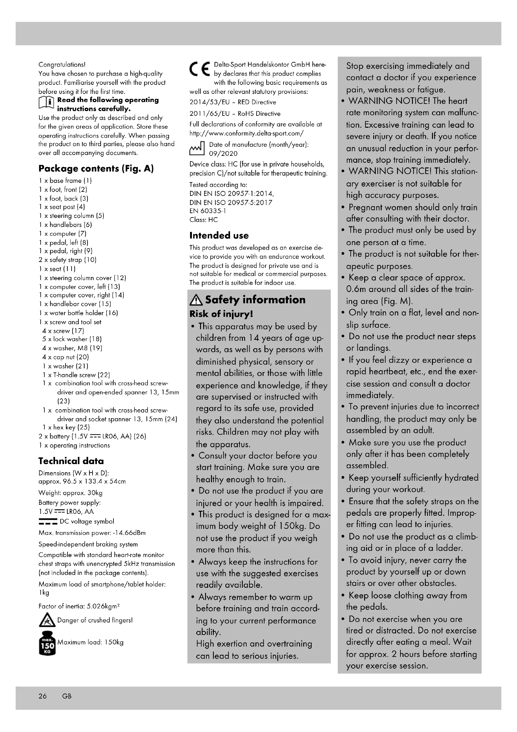 EN 60335-1 Class: HC Intended use This product was developed as an exercise de- vice to provide you with an endurance workout. The product is designed for private use and is not suitable for medical or commercial purposes. The product is suitable for indoor use. Safety information Risk of injury!