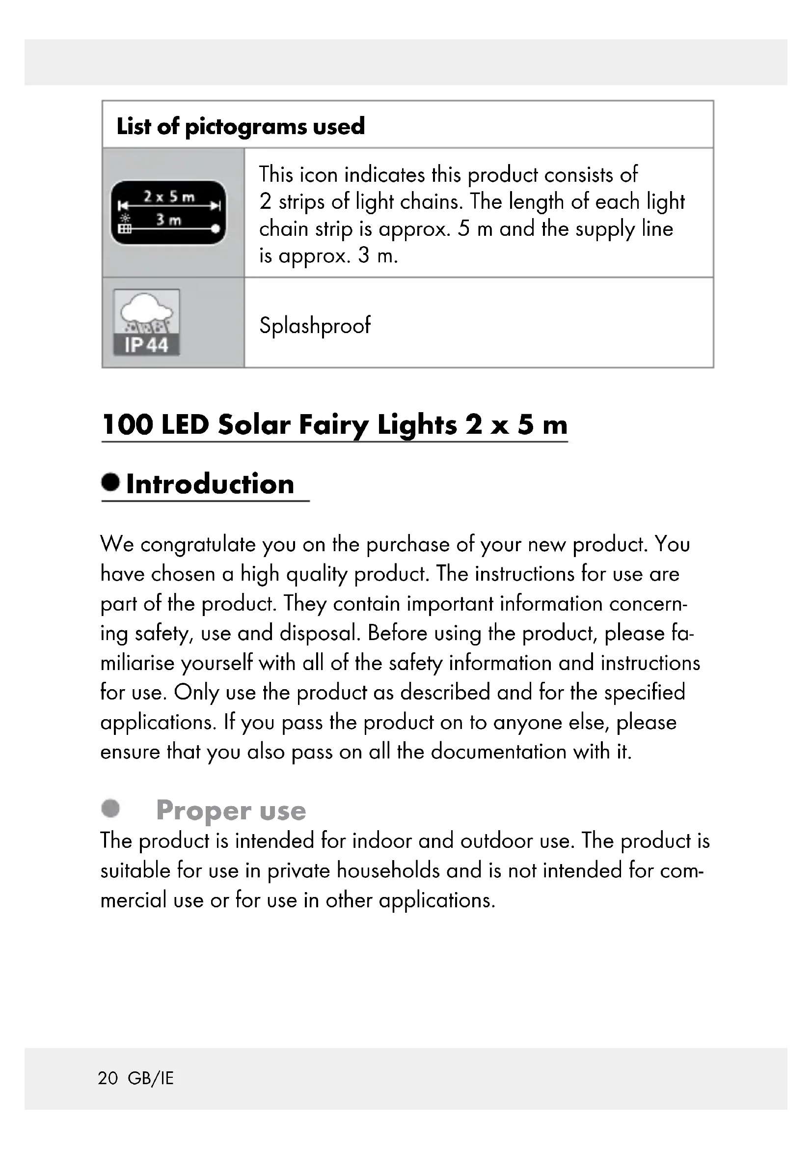 (alternating current). The product is not a toy and should not be played with by children. Children are not able to understand the dangers that can occur when handling the product.23 GB/IE WARNING! This lighting chain must not be used without all gaskets being in place. Product-specific safety instructions Make sure that the solar panel