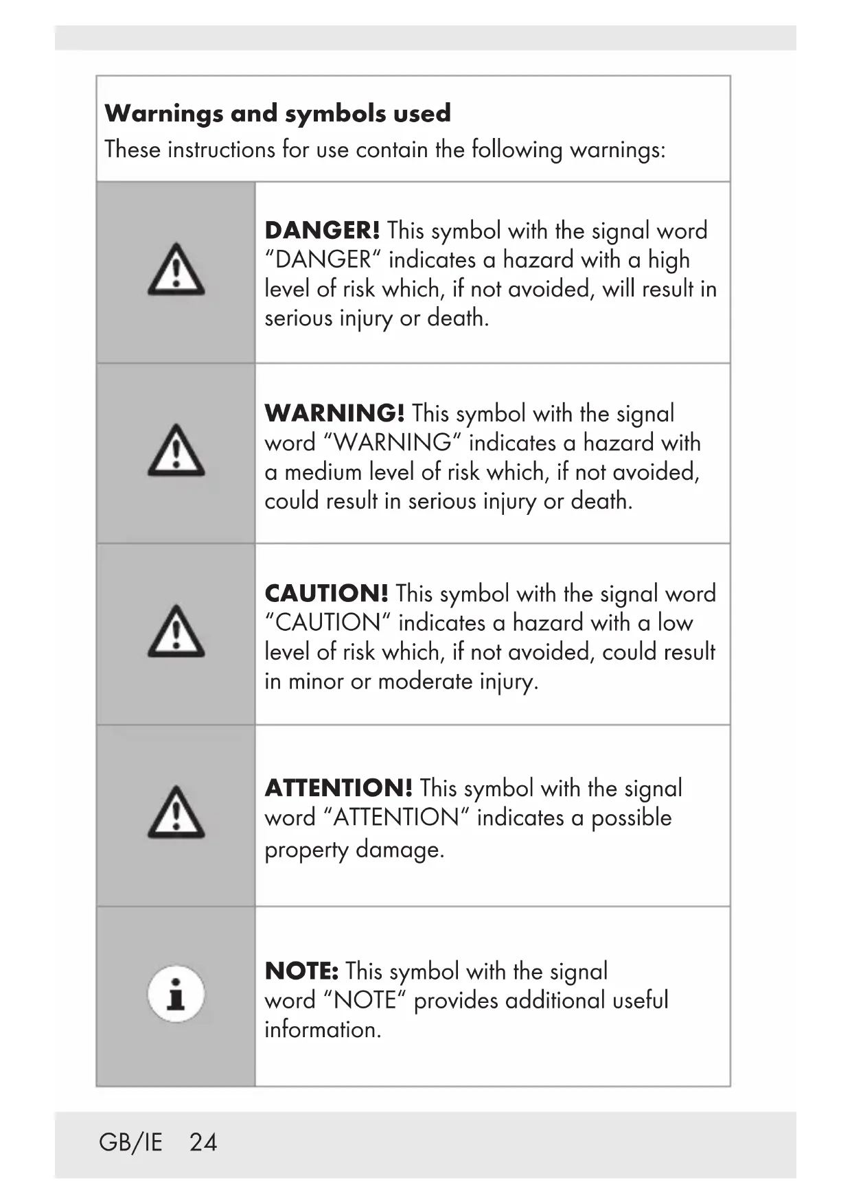WARNING! Never open the product casing. This product has no internal parts requiring maintenance. Do not independently convert or modify the product. Repairs to the product must be performed by authorised specialised companies or customer service. Improper repairs may place the user in considerable danger. They will also void the warranty. Do not expose the product to dripping water or splashing water and do not place containers filled with liquids such as vases or open drinks on top of or beside the product. Immediately switch the product off and remove the charging cable from the product if you smell burning or see smoke. Have the product examined by a qualified technician before using it again. If you use a USB power supply, the socket used must always be easily accessible so that the USB power supply can be quickly removed from the socket in the case of emergency. Please also refer to the manufacturer‘s instruction manual.GB/IE 31