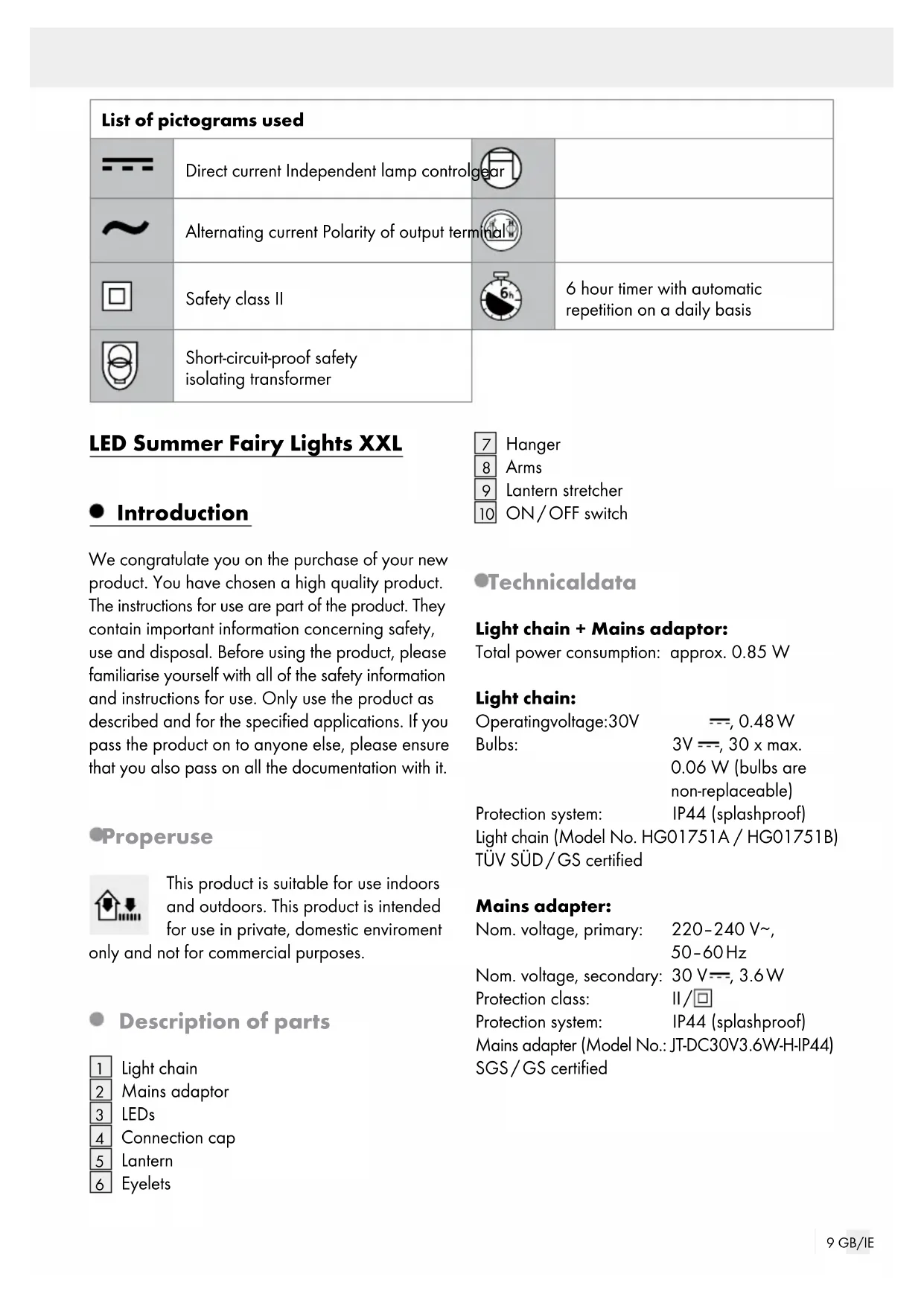 SGS / GS certified10 GB/IE Included items 1 LED Summer Fairy Lights XXL 15 lanterns 1 mains adapter 1 operating instructions Safety information