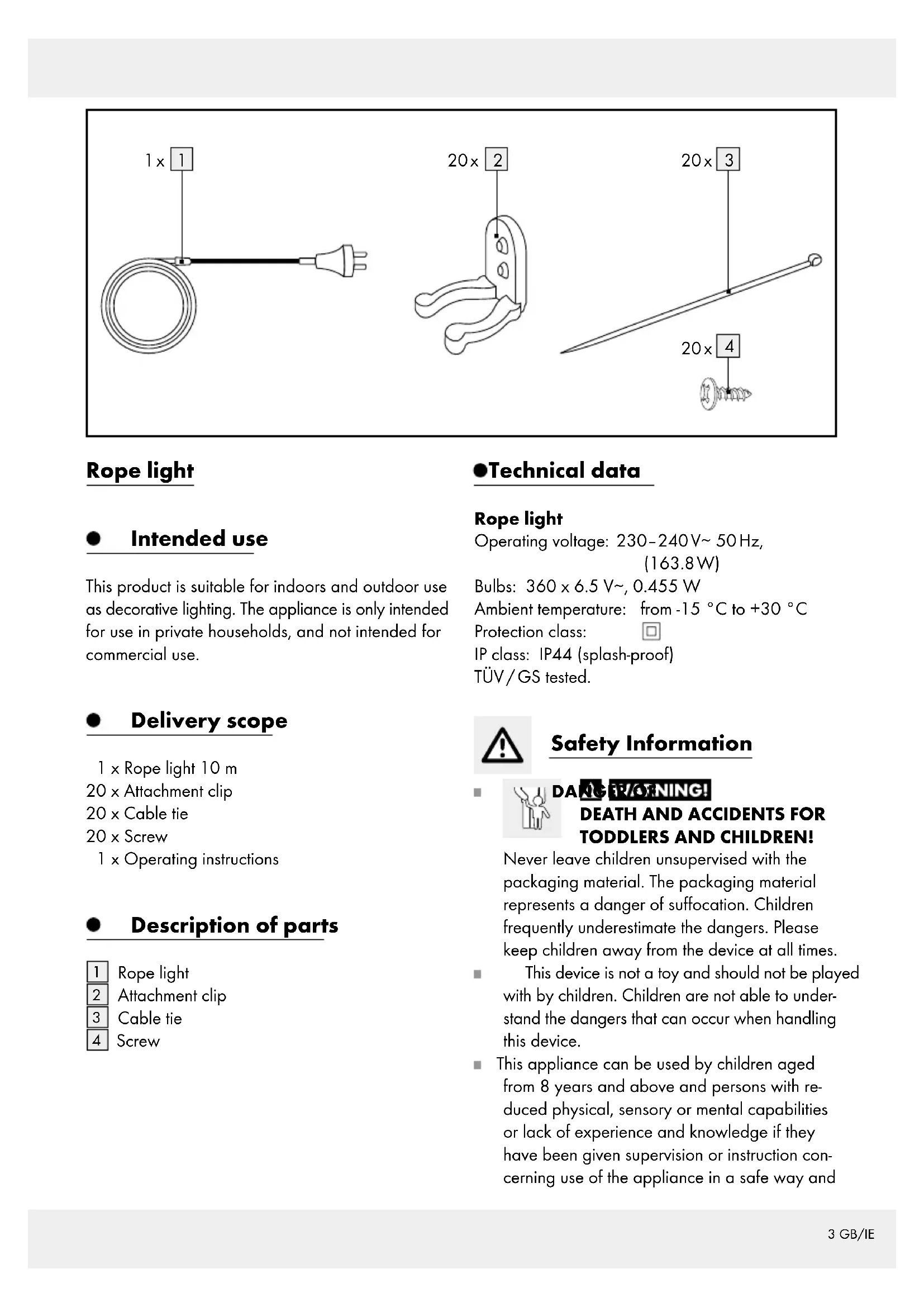 in the packaging or when it is rolled up. Ensure the rope light is mounted to provide adequate heat-circulation. Do not cover the rope light with blankets, cushions, or similar heat insulating materials. Use the lighting only with the parts described in these instructions. If the rope light is not to be used for any length of time (e.g. holidays), disconnect it from the power supply. After use, keep the rope light in the packaging to prevent unwanted damage. Keep away from ponds and other water reser- voirs. Install the rope light at least 2 metres away from water containers. Avoid place that might flood after heavy rainfall. If using the rope light outdoors, make sure it is connected to a socket which is protected with a faulty voltage protection switch (FI or RCD) for a maximum faulty voltage up to 30 mA. The rope light is protected against splashes of water (IP44) as long as the socket meets the minimum protection standard. Make sure the rope light is not laid down in areas where lawn mowers, trimmers, scissors or similar cutting tools are used. Do not pull the light chain cable and make sure it is laid down properly so that no one walks or trips over it. If in any doubt about the safe installation or use of this product, please consult a qualified electrician. Installation safety instructions Make sure that the product is only installed by competent persons. The rope light can be installed on all normally inflammable surfaces with the enclosed mounting parts. CAUTION! RISK OF ELECTRIC SHOCK! Make sure that there are no power, gas or water lines located where you wish to drill. Check with a cable and pipe locator if necessary be- fore you begin drilling. Before installation, check whether the surface is suitable for the mounting parts and the weight of the rope light. If you are in any doubt, consult an electrical specialist for advice. Do not use sharp and / or pointed objects such as wire, nails or fasteners to mount the rope light. Do not attach any additional objects to the rope light. Avoid excessive bending of the rope light. This can damage the insulation.5 GB/IE The bending radius of the rope must not fall below the following value: rope diameter between 10–14 mm: 2 cm. Avoid excessive heating of the rope light. A maximum of two sections of rope may cross or run parallel to each other. Installation Note: The rope light