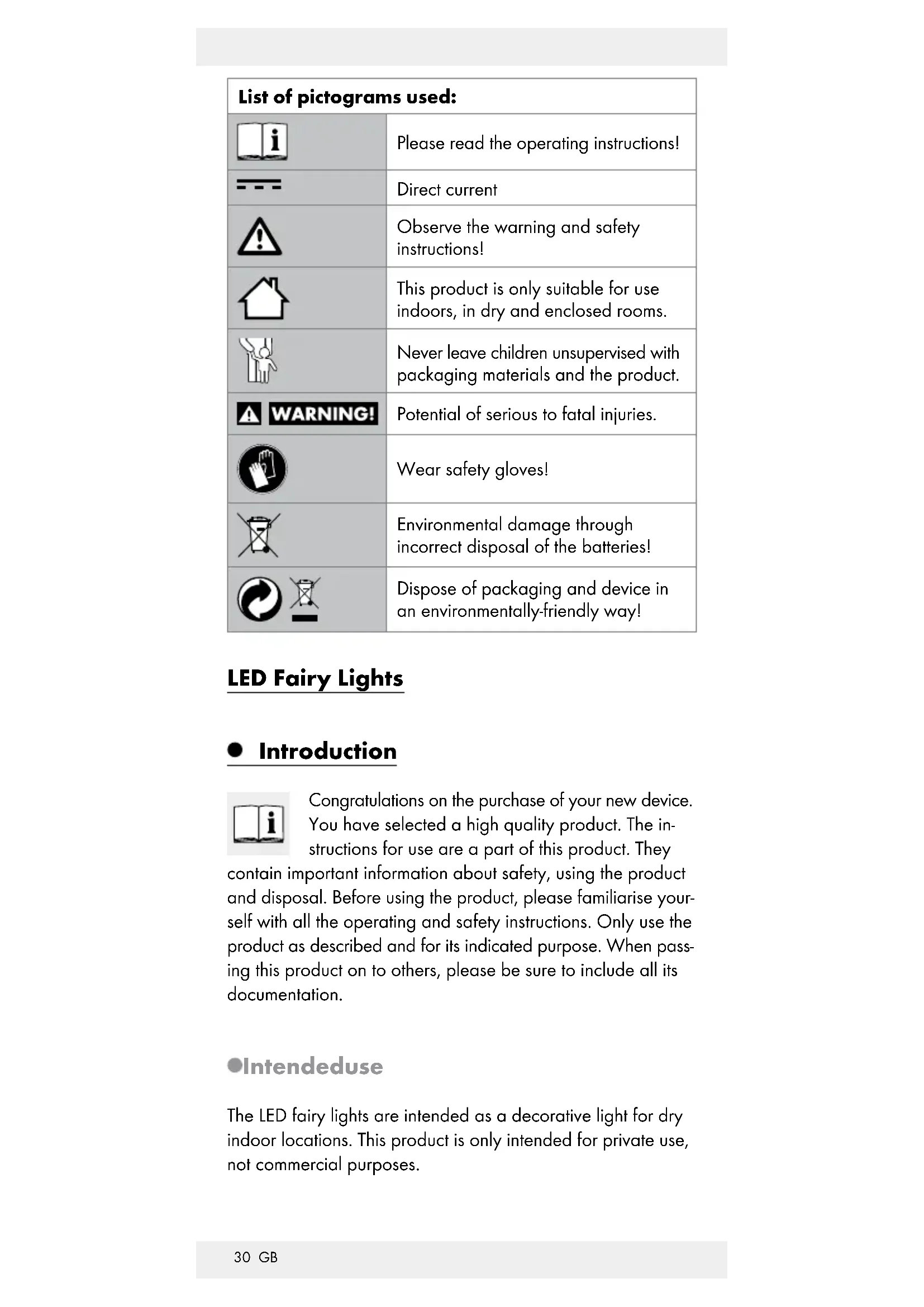 ON / OFF switch Technical specifications Bulb: 20 x 3 V Note: The bulbs cannot be replaced. Battery type: 2 x 1.5 V AA battery Product (Model No.: 10322A / B / C / D / E) 10322A: Silver snowflakes (LED light: warm white) 10322B: Silver stars (LED light: warm white) 10322C: White snowflakes (LED light: warm white) 10322D: Branches (LED light: warm white) 10322E: White beads (LED light: warm white) Includes 1 LED Fairy Lights 2 Batteries 1 Operating instructions Safety advice PLEASE KEEP THE INSTRUCTIONS FOR USE IN A SAFE PLACE!
