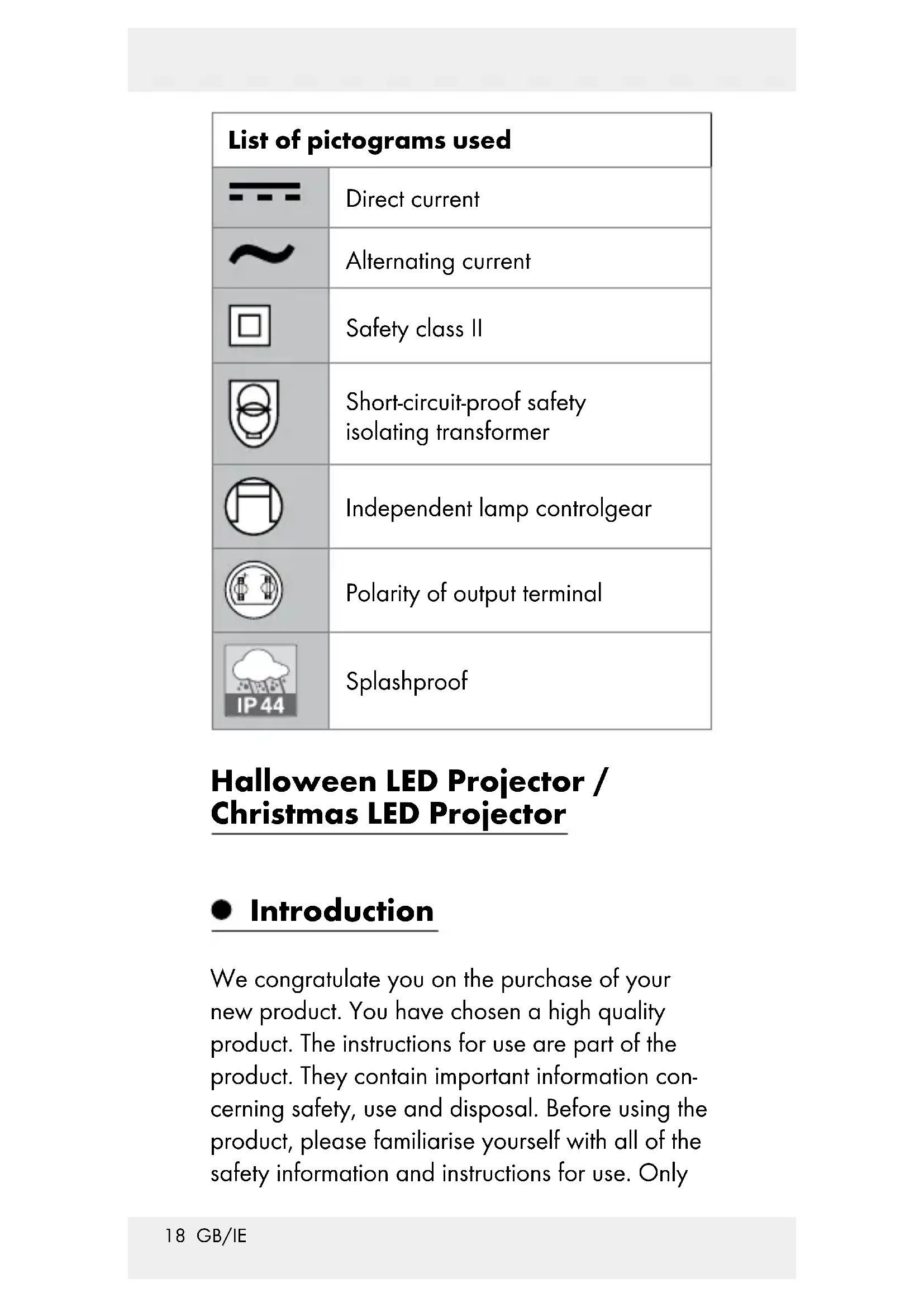 50–60 Hz Output voltage: 12 V , 6 W Protection class: / II Degree of protection: IP44 (Splashproof) Mains adapter (Model No.: JT-DC12V6W-H1-IP44) SGS GS certified. Included items 1 Halloween LED Projector / Christmas LED Projector 1 Mains adapter 1 Ground spike with screw 1 Operating instructions21 GB/IE Safety information