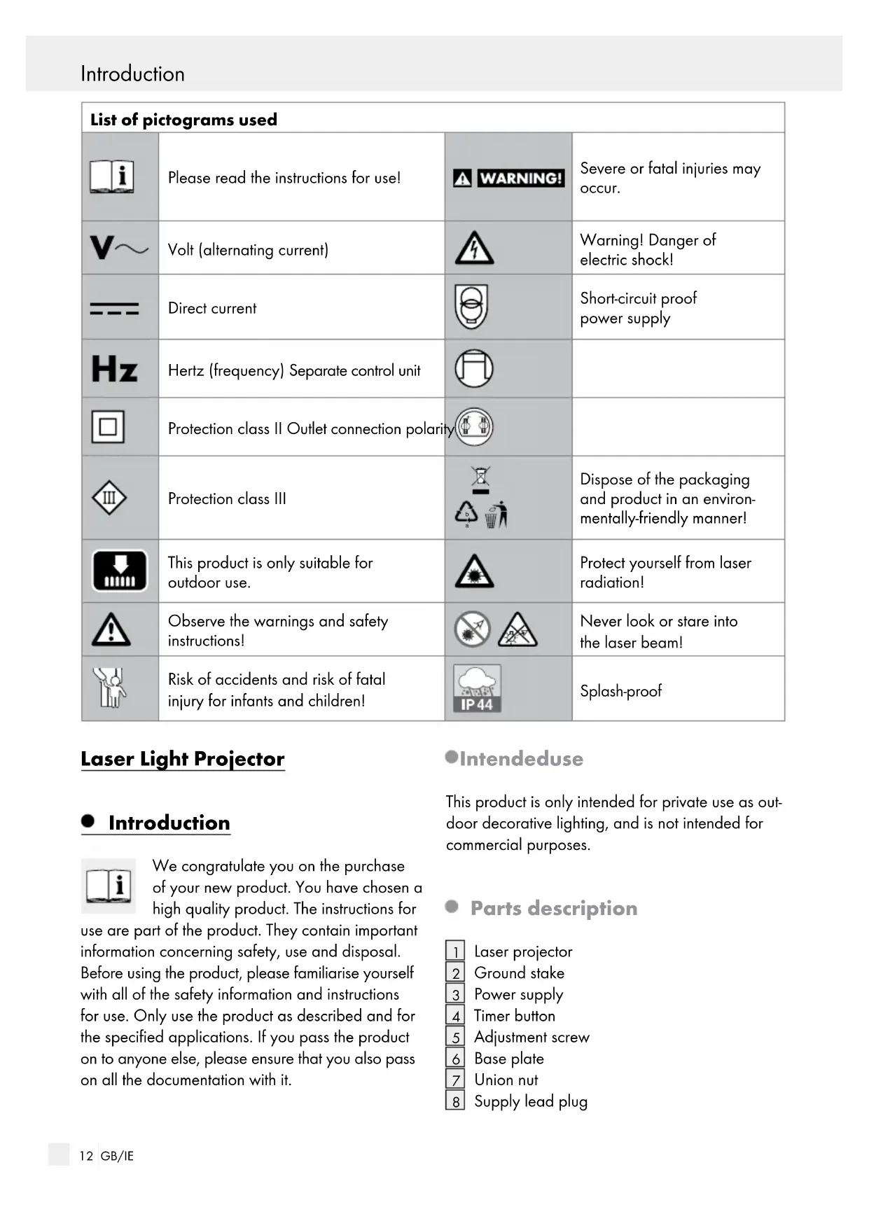 Dispose of the packaging and product in an environ- mentally-friendly manner! This product is only suitable for outdoor use. Protect yourself from laser radiation! Observe the warnings and safety instructions! Never look or stare into the laser beam! Risk of accidents and risk of fatal injury for infants and children! Splash-proof Laser Light Projector Introduction We congratulate you on the purchase of your new product. You have chosen a high quality product. The instructions for use are part of the product. They contain important information concerning safety, use and disposal. Before using the product, please familiarise yourself with all of the safety information and instructions for use. Only use the product as described and for the specified applications. If you pass the product on to anyone else, please ensure that you also pass on all the documentation with it. Intended use This product is only intended for private use as out- door decorative lighting, and is not intended for commercial purposes. Parts description