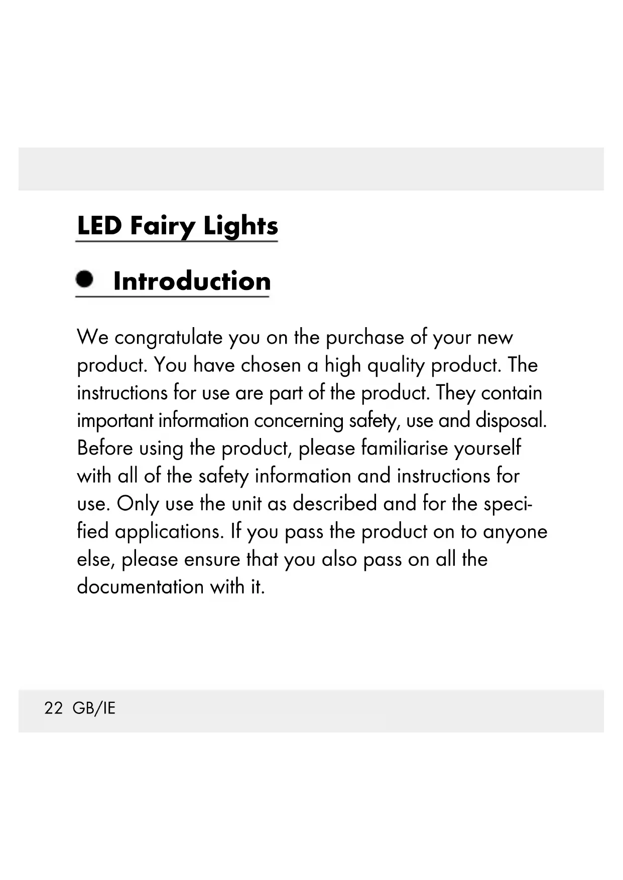 Batteries Technical specifications LED: 20 x 3 V approx. 0.015 W Battery type: 3 x 1.5 V AA battery24 GB/IE Includes 1 Decorative LED Lights 3 Batteries 1 Operating instructions Safety advice PLEASE KEEP THE INSTRUCTIONS FOR USE IN A SAFE PLACE!
