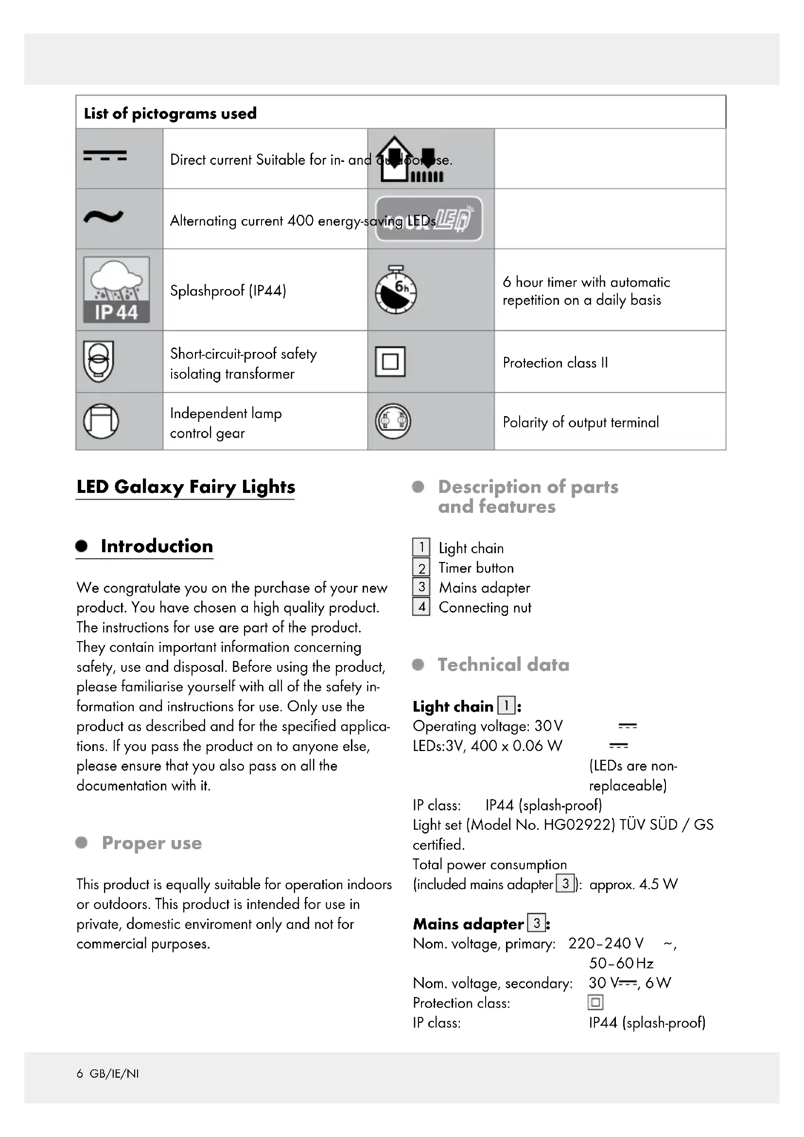 50–60 Hz Nom. voltage, secondary: 30 V , 6 W Protection class: IP class: IP44 (splash-proof)7 GB/IE/NI Mains adapter (Model no. JT-DC30V6W-H1-IP44) SGS / GS tested. Included items 1 Light chain 1 Mains adapter 1 Operating instructions Safety information