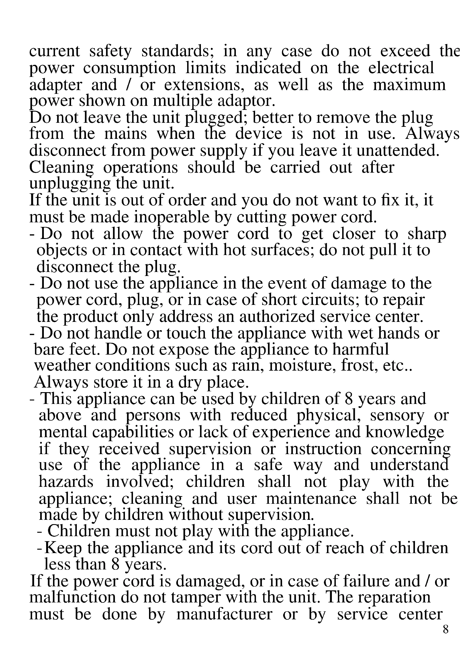 The following are important notes on the installation, use and maintenance; save this instruction manual for future reference; use the equipment only as specified in this guide; any other use is considered improper and dangerous; therefore, the manufacturer cannot be held responsible in the event of damages caused by improper, incorrect or unreasonable use. Before use, ensure the equipment is undamaged; if in doubt, do not attempt to use it and contact the authorized service center; do not leave packing materials (i.e. plastic bags, polystyrene foam, nails, staples, etc.) within the reach of children as they are potential sources of danger; always remember that they must be separately collected. Make sure that the rating information given on the technical label are compatible with those of the electricity grid; the installation must be performed according to the manufacturer's instructions considering the maximum power of the appliance as shown on the label; an incorrect installation may cause damage to people, animals or things, for which the manufacturer cannot be considered responsible thereof. If it is necessary to use adapters, multiple sockets or electrical extensions, use only those that comply with8 current safety standards; in any case do not exceed the power consumption limits indicated on the electrical adapter and / or extensions, as well as the maximum power shown on multiple adaptor. Do not leave the unit plugged; better to remove the plug from the mains when the device is not in use. Always disconnect from power supply if you leave it unattended. Cleaning operations should be carried out after unplugging the unit. If the unit is out of order and you do not want to fix it, it must be made inoperable by cutting power cord. - Do not allow the power cord to get closer to sharp objects or in contact with hot surfaces; do not pull it to disconnect the plug. - Do not use the appliance in the event of damage to the power cord, plug, or in case of short circuits; to repair the product only address an authorized service center. - Do not handle or touch the appliance with wet hands or bare feet. Do not expose the appliance to harmful weather conditions such as rain, moisture, frost, etc.. Always store it in a dry place. - This appliance can be used by children of 8 years and above and persons with reduced physical, sensory or mental capabilities or lack of experience and knowledge if they received supervision or instruction concerning use of the appliance in a safe way and understand hazards involved; children shall not play with the appliance; cleaning and user maintenance shall not be made by children without supervision. - Children must not play with the appliance. - Keep the appliance and its cord out of reach of children less than 8 years. If the power cord is damaged, or in case of failure and / or malfunction do not tamper with the unit. The reparation must be done by manufacturer or by service center9 authorized by the manufacturer in order to prevent any risk. Failure to comply with the above may compromise the unit safety and invalidate the warranty. - This appliance is intended to be used in household and similar applications such as: staff kitchen areas in shops, offices and other working environments; by clients in hotels, motels and other residential type environments; farm houses, bed and breakfast type environments. - The appliance is not intended to be operated by means of an external timer or separate remote-control system. - Before every use, unroll the power cord. - Use original spare parts and accessories only. - Do not subject the product to strong impacts, serious damages may result. GENERAL INFORMATION - Do not connect the electric plug since the installation is not complete. - Do not leave the appliance unattended while it is running. Unplug after each use. - Unplug the unit by pulling the plug and not the power cord. - Do not immerse product in water or other liquids and avoid splashing liquids reach the unit. - Before carrying out any cleaning, disconnect the unit from the electrical outlet. - Before each use, unroll the power cord. Do not insert anything through the protection grids. - Do not obstruct in any way the protection grids. - Place on solid and stable surfaces and away from windows or drafts.
