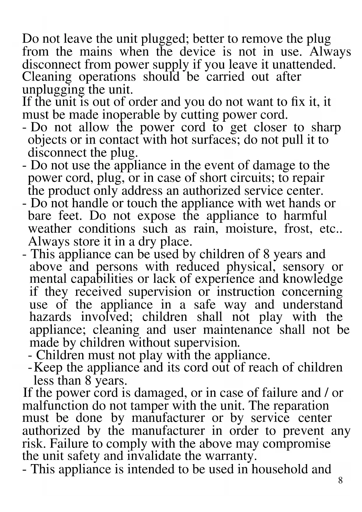 The following are important notes on the installation, use and maintenance; save this instruction manual for future reference; use the equipment only as specified in this guide; any other use is considered improper and dangerous; therefore, the manufacturer cannot be held responsible in the event of damages caused by improper, incorrect or unreasonable use. Before use, ensure the equipment is undamaged; if in doubt, do not attempt to use it and contact the authorized service center; do not leave packing materials (i.e. plastic bags, polystyrene foam, nails, staples, etc.) within the reach of children as they are potential sources of danger; always remember that they must be separately collected. Make sure that the rating information given on the technical label are compatible with those of the electricity grid; the installation must be performed according to the manufacturer's instructions considering the maximum power of the appliance as shown on the label; an incorrect installation may cause damage to people, animals or things, for which the manufacturer cannot be considered responsible thereof. If it is necessary to use adapters, multiple sockets or electrical extensions, use only those that comply with current safety standards; in any case do not exceed the power consumption limits indicated on the electrical adapter and / or extensions, as well as the maximum power shown on multiple adaptor.8 Do not leave the unit plugged; better to remove the plug from the mains when the device is not in use. Always disconnect from power supply if you leave it unattended. Cleaning operations should be carried out after unplugging the unit. If the unit is out of order and you do not want to fix it, it must be made inoperable by cutting power cord. - Do not allow the power cord to get closer to sharp objects or in contact with hot surfaces; do not pull it to disconnect the plug. - Do not use the appliance in the event of damage to the power cord, plug, or in case of short circuits; to repair the product only address an authorized service center. - Do not handle or touch the appliance with wet hands or bare feet. Do not expose the appliance to harmful weather conditions such as rain, moisture, frost, etc.. Always store it in a dry place. - This appliance can be used by children of 8 years and above and persons with reduced physical, sensory or mental capabilities or lack of experience and knowledge if they received supervision or instruction concerning use of the appliance in a safe way and understand hazards involved; children shall not play with the appliance; cleaning and user maintenance shall not be made by children without supervision. - Children must not play with the appliance. - Keep the appliance and its cord out of reach of children less than 8 years. If the power cord is damaged, or in case of failure and / or malfunction do not tamper with the unit. The reparation must be done by manufacturer or by service center authorized by the manufacturer in order to prevent any risk. Failure to comply with the above may compromise the unit safety and invalidate the warranty. - This appliance is intended to be used in household and9 similar applications such as: staff kitchen areas in shops, offices and other working environments; by clients in hotels, motels and other residential type environments; farm houses, bed and breakfast type environments. - The appliance is not intended to be operated by means of an external timer or separate remote-control system. - Before every use, unroll the power cord. - Use original spare parts and accessories only. - Do not subject the product to strong impacts, serious damages may result. GENERAL INFORMATION - Do not connect the electric plug since the installation is not complete. - Do not leave the appliance unattended while it is running. Unplug after each use. - Unplug the unit by pulling the plug and not the power cord. - Do not immerse product in water or other liquids and avoid splashing liquids reach the unit. - Before carrying out any cleaning, disconnect the unit from the electrical outlet. - Before each use, unroll the power cord. Do not insert anything through the protection grids. - Do not obstruct in any way the protection grids. - Place on solid and stable surfaces and away from windows or drafts. DESCRIPTION G50034 1 Front protection grid 2 Fan stopper 3 Fan 4 Screws for rear fan stop 5 Rear protection grid 6 Drive shaft 7 Oscillation pin 8 Motor housing 9 Inclination pin 10 Control panel 11 Base 12 Handle 13 Tilt knob 14 Screw 1 15 Base top 16 Front grid fixing screw 17 Screw 2 18 Fixing knob ASSEMBLING The fan motor can work even if the protective grids have not yet been assembled and fixed. To ensure the maximum safety, perform the installation completely before operating.