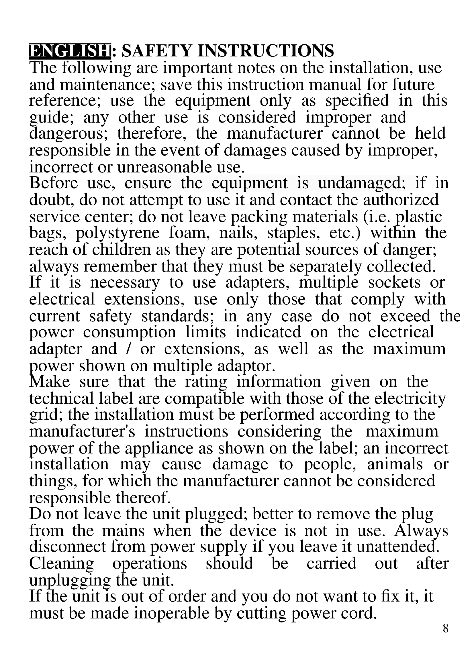 The following are important notes on the installation, use and maintenance; save this instruction manual for future reference; use the equipment only as specified in this guide; any other use is considered improper and dangerous; therefore, the manufacturer cannot be held responsible in the event of damages caused by improper, incorrect or unreasonable use. Before use, ensure the equipment is undamaged; if in doubt, do not attempt to use it and contact the authorized service center; do not leave packing materials (i.e. plastic bags, polystyrene foam, nails, staples, etc.) within the reach of children as they are potential sources of danger; always remember that they must be separately collected. If it is necessary to use adapters, multiple sockets or electrical extensions, use only those that comply with current safety standards; in any case do not exceed the power consumption limits indicated on the electrical adapter and / or extensions, as well as the maximum power shown on multiple adaptor. Make sure that the rating information given on the technical label are compatible with those of the electricity grid; the installation must be performed according to the manufacturer's instructions considering the maximum power of the appliance as shown on the label; an incorrect installation may cause damage to people, animals or things, for which the manufacturer cannot be considered responsible thereof. Do not leave the unit plugged; better to remove the plug from the mains when the device is not in use. Always disconnect from power supply if you leave it unattended. Cleaning operations should be carried out after unplugging the unit. If the unit is out of order and you do not want to fix it, it must be made inoperable by cutting power cord.9 - Do not allow the power cord to get closer to sharp objects or in contact with hot surfaces; do not pull it to disconnect the plug. - Do not use the appliance in the event of damage to the power cord, plug, or in case of short circuits; to repair the product only address an authorized service center. - Do not handle or touch the appliance with wet hands or bare feet. Do not expose the appliance to harmful weather conditions such as rain, moisture, frost, etc.. Always store it in a dry place. - This appliance can be used by children of 8 years and above and persons with reduced physical, sensory or mental capabilities or lack of experience and knowledge if they received supervision or instruction concerning use of the appliance in a safe way and understand hazards involved; children shall not play with the appliance; cleaning and user maintenance shall not be made by children without supervision. - Keep the appliance and its cord out of reach of children less than 8 years. - Children must not play with the appliance. If the power cord is damaged, or in case of failure and / or malfunction do not tamper with the unit. The reparation must be done by manufacturer or by service center authorized by the manufacturer in order to prevent any risk. Failure to comply with the above may compromise the unit safety and invalidate the warranty.
