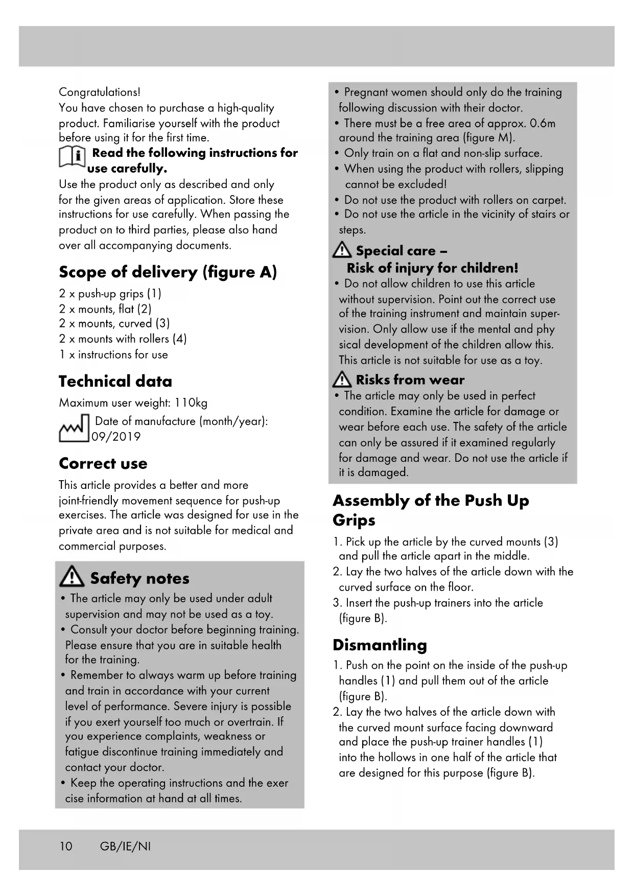 the curved mount surface facing downward and place the push-up trainer handles (1) into the hollows in one half of the article that are designed for this purpose (figure B). Congratulations! You have chosen to purchase a high-quality product. Familiarise yourself with the product before using it for the first time. Read the following instructions for use carefully. Use the product only as described and only for the given areas of application. Store these instructions for use carefully. When passing the product on to third parties, please also hand over all accompanying documents. Scope of delivery (figure A) 2 x push-up grips (1) 2 x mounts, flat (2) 2 x mounts, curved (3) 2 x mounts with rollers (4) 1 x instructions for use Technical data Maximum user weight: 110kg Date of manufacture (month/year): 09/2019 Correct use This article provides a better and more joint-friendly movement sequence for push-up exercises. The article was designed for use in the private area and is not suitable for medical and commercial purposes. Safety notes