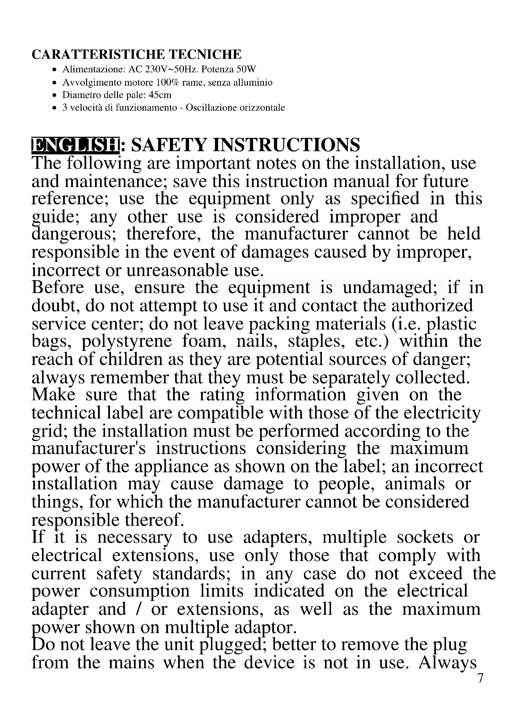 The following are important notes on the installation, use and maintenance; save this instruction manual for future reference; use the equipment only as specified in this guide; any other use is considered improper and dangerous; therefore, the manufacturer cannot be held responsible in the event of damages caused by improper, incorrect or unreasonable use. Before use, ensure the equipment is undamaged; if in doubt, do not attempt to use it and contact the authorized service center; do not leave packing materials (i.e. plastic bags, polystyrene foam, nails, staples, etc.) within the reach of children as they are potential sources of danger; always remember that they must be separately collected. Make sure that the rating information given on the technical label are compatible with those of the electricity grid; the installation must be performed according to the manufacturer's instructions considering the maximum power of the appliance as shown on the label; an incorrect installation may cause damage to people, animals or things, for which the manufacturer cannot be considered responsible thereof. If it is necessary to use adapters, multiple sockets or electrical extensions, use only those that comply with current safety standards; in any case do not exceed the power consumption limits indicated on the electrical adapter and / or extensions, as well as the maximum power shown on multiple adaptor. Do not leave the unit plugged; better to remove the plug from the mains when the device is not in use. Always8 disconnect from power supply if you leave it unattended. Cleaning operations should be carried out after unplugging the unit. If the unit is out of order and you do not want to fix it, it must be made inoperable by cutting power cord. - Do not allow the power cord to get closer to sharp objects or in contact with hot surfaces; do not pull it to disconnect the plug. - Do not use the appliance in the event of damage to the power cord, plug, or in case of short circuits; to repair the product only address an authorized service center. - Do not handle or touch the appliance with wet hands or bare feet. Do not expose the appliance to harmful weather conditions such as rain, moisture, frost, etc.. Always store it in a dry place. - This appliance can be used by children of 8 years and above and persons with reduced physical, sensory or mental capabilities or lack of experience and knowledge if they received supervision or instruction concerning use of the appliance in a safe way and understand hazards involved; children shall not play with the appliance; cleaning and user maintenance shall not be made by children without supervision. - Children must not play with the appliance. - Keep the appliance and its cord out of reach of children less than 8 years. If the power cord is damaged, or in case of failure and / or malfunction do not tamper with the unit. The reparation must be done by manufacturer or by service center authorized by the manufacturer in order to prevent any risk. Failure to comply with the above may compromise the unit safety and invalidate the warranty. - This appliance is intended to be used in household and similar applications such as: staff kitchen areas in shops, offices and other working environments; by clients in9 hotels, motels and other residential type environments; farm houses, bed and breakfast type environments. - The appliance is not intended to be operated by means of an external timer or separate remote-control system. - Before every use, unroll the power cord. - Use original spare parts and accessories only. - Do not subject the product to strong impacts, serious damages may result. GENERAL INFORMATION - Do not connect the electric plug since the installation is not complete. - Do not leave the appliance unattended while it is running. Unplug after each use. - Unplug the unit by pulling the plug and not the power cord. - Do not immerse product in water or other liquids and avoid splashing liquids reach the unit. - Before carrying out any cleaning, disconnect the unit from the electrical outlet. - Before each use, unroll the power cord. Do not insert anything through the protection grids. - Do not obstruct in any way the protection grids. - Place on solid and stable surfaces and away from windows or drafts. DESCRIPTION G50037 1 Front protection grid 2 Fan stopper 3 Fan 4 Screws for rear fan stop 5 Rear protection grid 6 Drive shaft 7 Oscillation pin 8 Motor housing 9 Inclination pin 10 Control panel 11 Pole 12 Handle 13 Tilt knob 14 Screw 1 15 Base top 16 Front grid fixing screw 17 Screw 2 18 Fixing knob 19 Height knob 20 Tripod holder 21 Legs 22 Rubber feet ASSEMBLING The fan motor can work even if the protective grids have not yet been assembled and fixed. To ensure the maximum safety, perform the installation completely before operating.