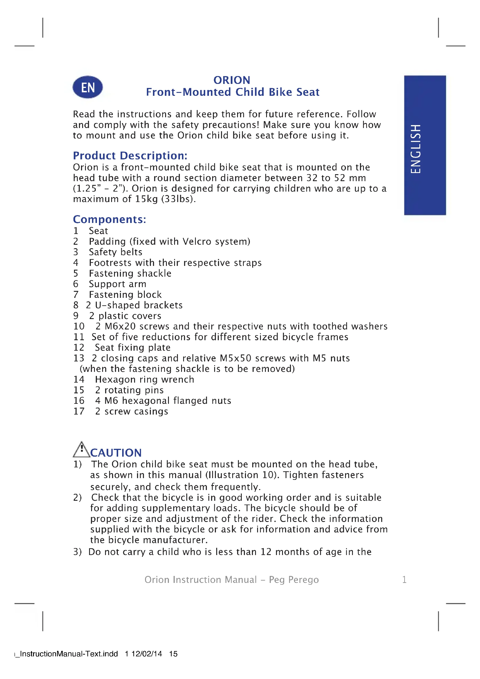 ENGLISH Orion_InstructionManual-Text.indd 1 12/02/14 15:472 Orion Instruction Manual - Peg Perego Child Bike Seat. A child must be able to sit independently and comfortably in the child bike seat. Please consult a pediatrician regarding children under 12 months.