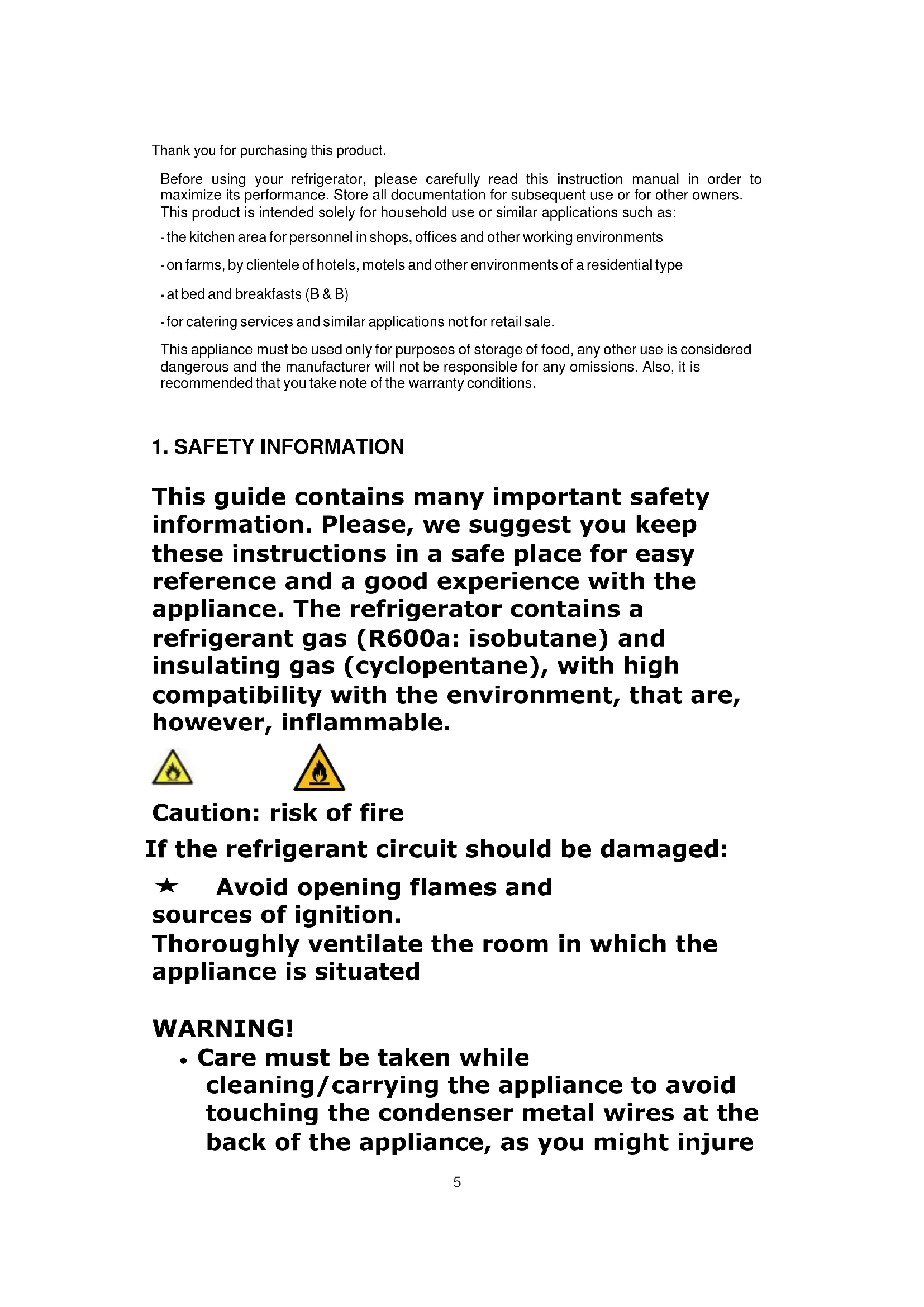 This guide contains many important safety information. Please, we suggest you keep these instructions in a safe place for easy reference and a good experience with the appliance. The refrigerator contains a refrigerant gas (R600a: isobutane) and insulating gas (cyclopentane), with high compatibility with the environment, that are, however, inflammable. Caution: risk of fire If the refrigerant circuit should be damaged: