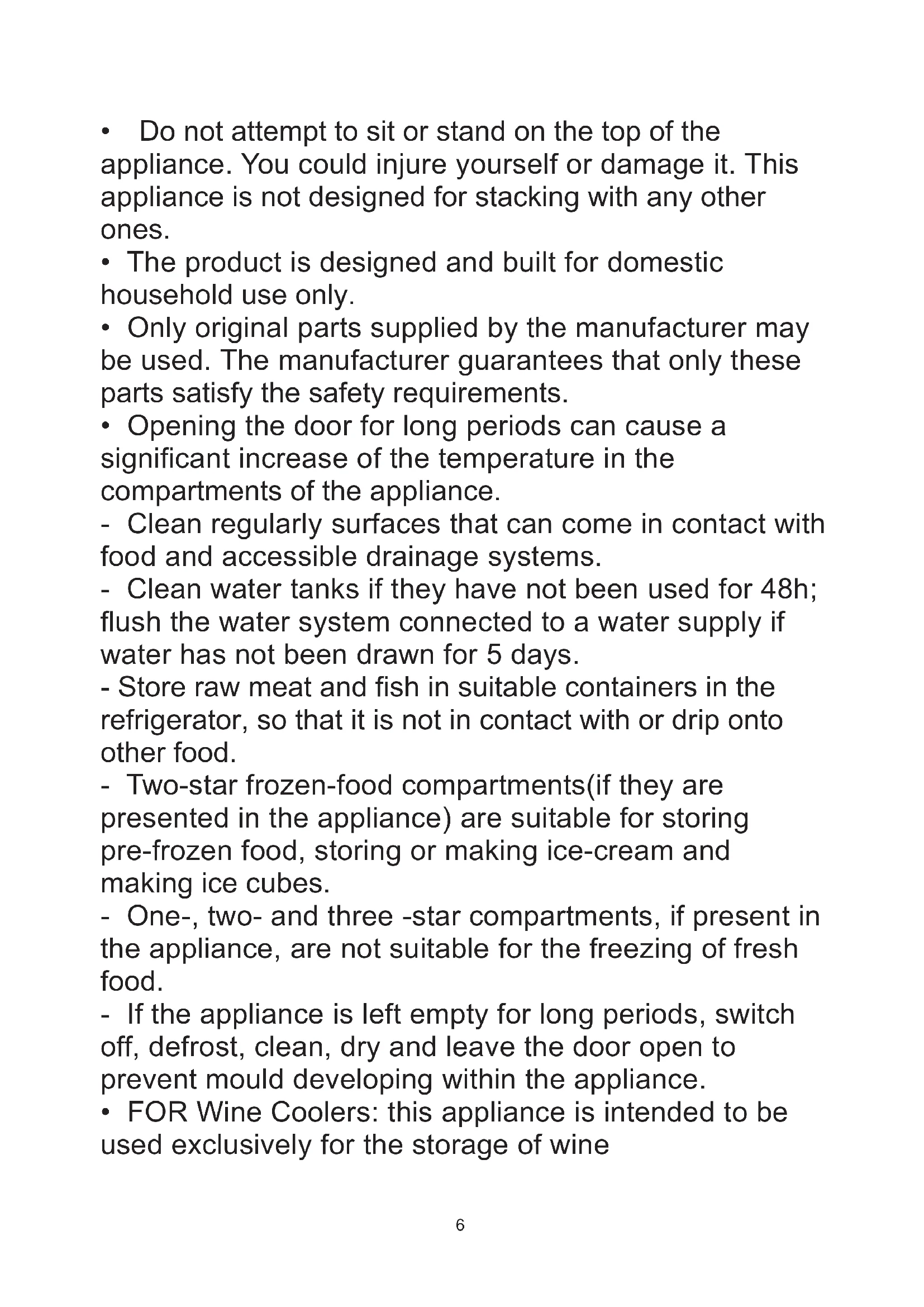 - FOR Wine Coolers: this appliance is intended to be used exclusively for the storage of wine 6• FOR a free standing appliance: this refrigerating appliance is not intended to be used as a built-in appliance