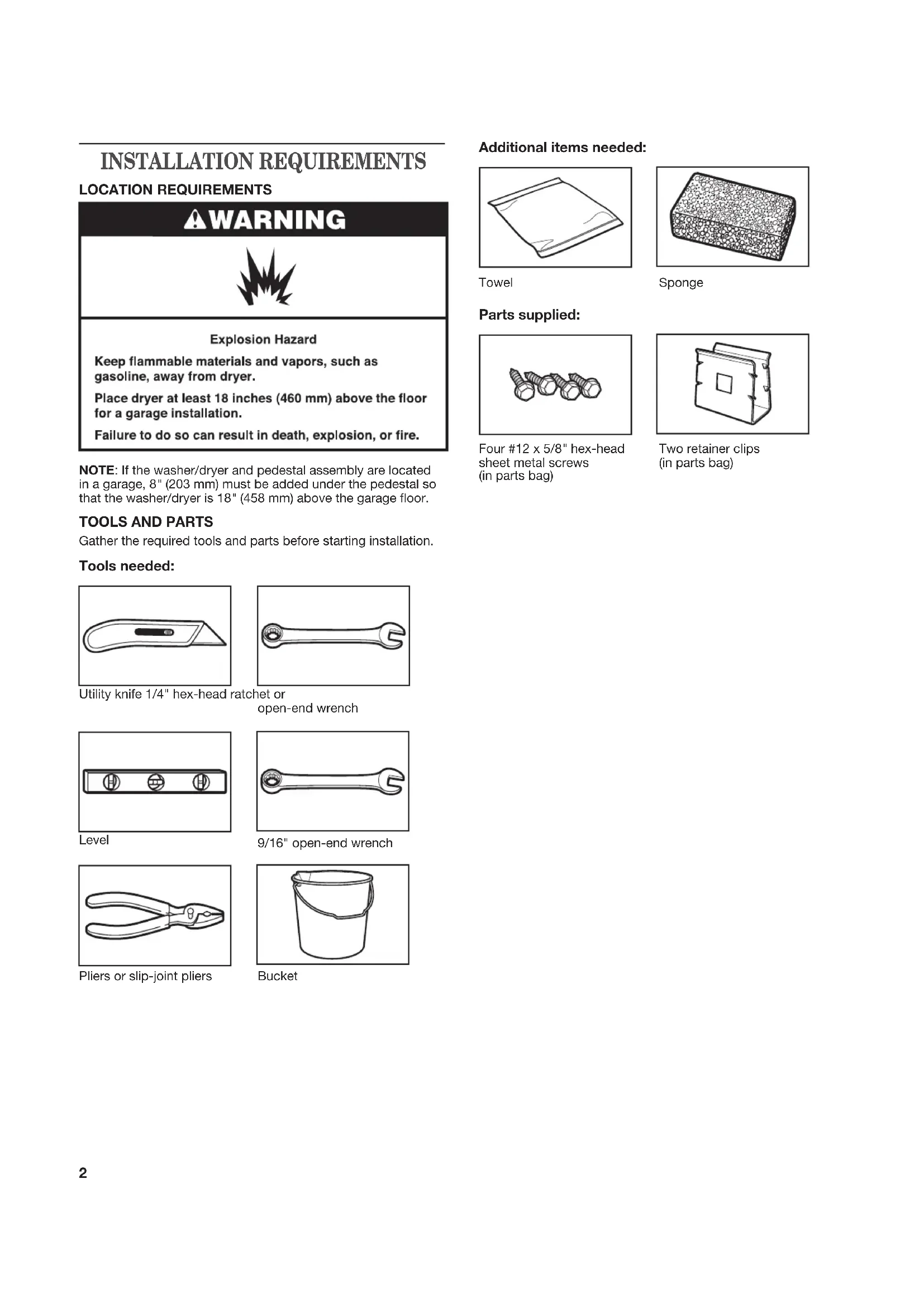 Gather the required tools and parts before starting installation. Tools needed: Additional items needed: Four #12 x 5/8" hex-head sheet metal screws (in parts bag) Two retainer clips (in parts bag) Parts supplied:3 Uninstalling your gas dryer