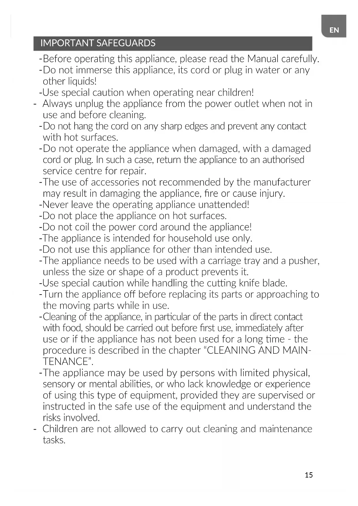 The appliance may be used by persons with limited physical, sensory or mental abilies, or who lack knowledge or experience of using this type of equipment, provided they are supervised or instructed in the safe use of the equipment and understand the risks involved. - Children are not allowed to carry out cleaning and maintenance tasks.16