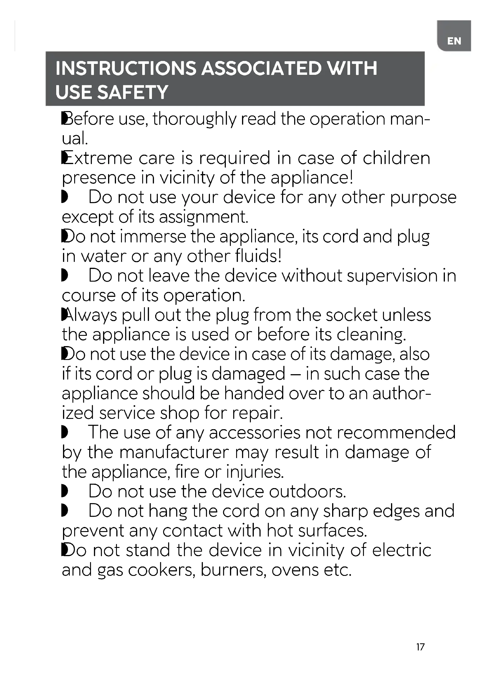 Do not use the device in case of its damage, also if its cord or plug is damaged – in such case the appliance should be handed over to an author- ized service shop for repair. The use of any accessories not recommended by the manufacturer may result in damage of the appliance, fire or injuries. Do not use the device outdoors. Do not hang the cord on any sharp edges and prevent any contact with hot surfaces.