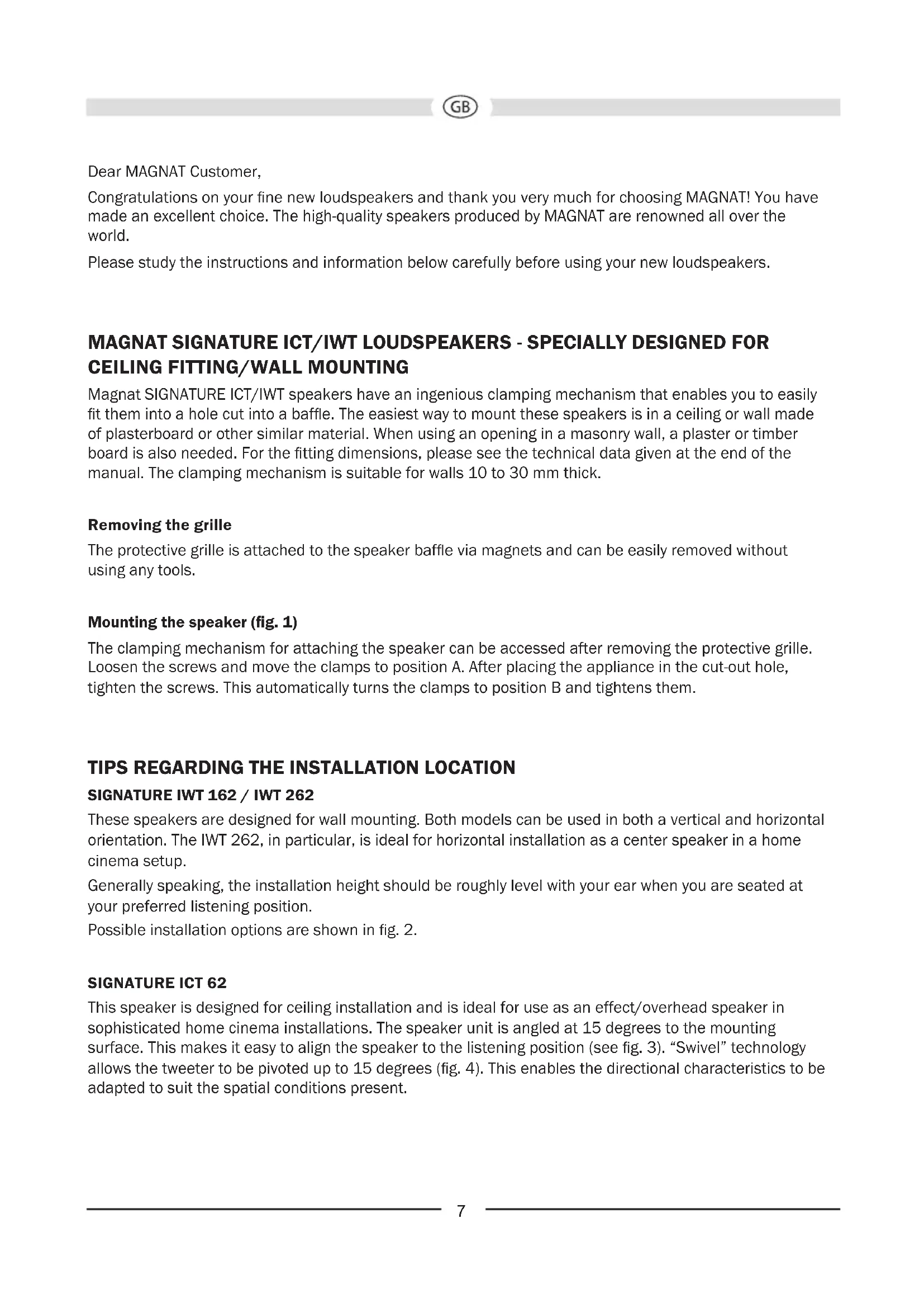 Fig. 7 shows the loudspeakers connected to a stereo amplier.9 HOW TO AVOID DAMAGE TO YOUR VALUABLE SPEAKERS All MAGNAT loudspeakers are designed and built for optimum sound reproduction with the tone controls in the central position – i.e. with “linear” amplier output. Turning up the bass and treble controls too far delivers more power to the woofers and/or tweeters, and at high volumes this can actually destroy the speaker units! If the output of your amplier is signicantly higher than the rated power handling capacity of your speakers extremely high volumes can physically destroy your speakers. This doesn’t actually happen often but you should be aware that it is possible. Weak ampliers with low output ratings can actually be more dangerous for your speakers at medium volumes because weak ampliers may overload much faster than powerful ones and this causes measurable and audible distortion, which is extremely dangerous to your loudspeakers. Always turn the volume down immediately as soon as you hear distortion! If you like listening to loud music make sure that your amplier can deliver at least as much power as the speakers’ power-handling rating. THE SOUND YOU CAN’T HEAR... Ampliers, tuners and CD/DVD players can all produce inaudible high-frequency signals – and this doesn’t only apply to cheap products. If your tweeters fail at low or medium volumes you should have a qualied technician check your system components for dangerous inaudible signals. SPECIFICATIONS SIGNATURE ICT 62 Power-handling capacity: 110 / 180 W Impedance: 4 ohms Crossover frequency: 3100 Hz Frequency response: 32 – 28 000 Hz Recommended amplier output: 20 – 180 W Efciency (1W/1m): 91 dB External dimensions Ø: 238 mm Hole cut-out Ø: 209 mm Mounting depth: 130 mm Weight: 1.82 kg