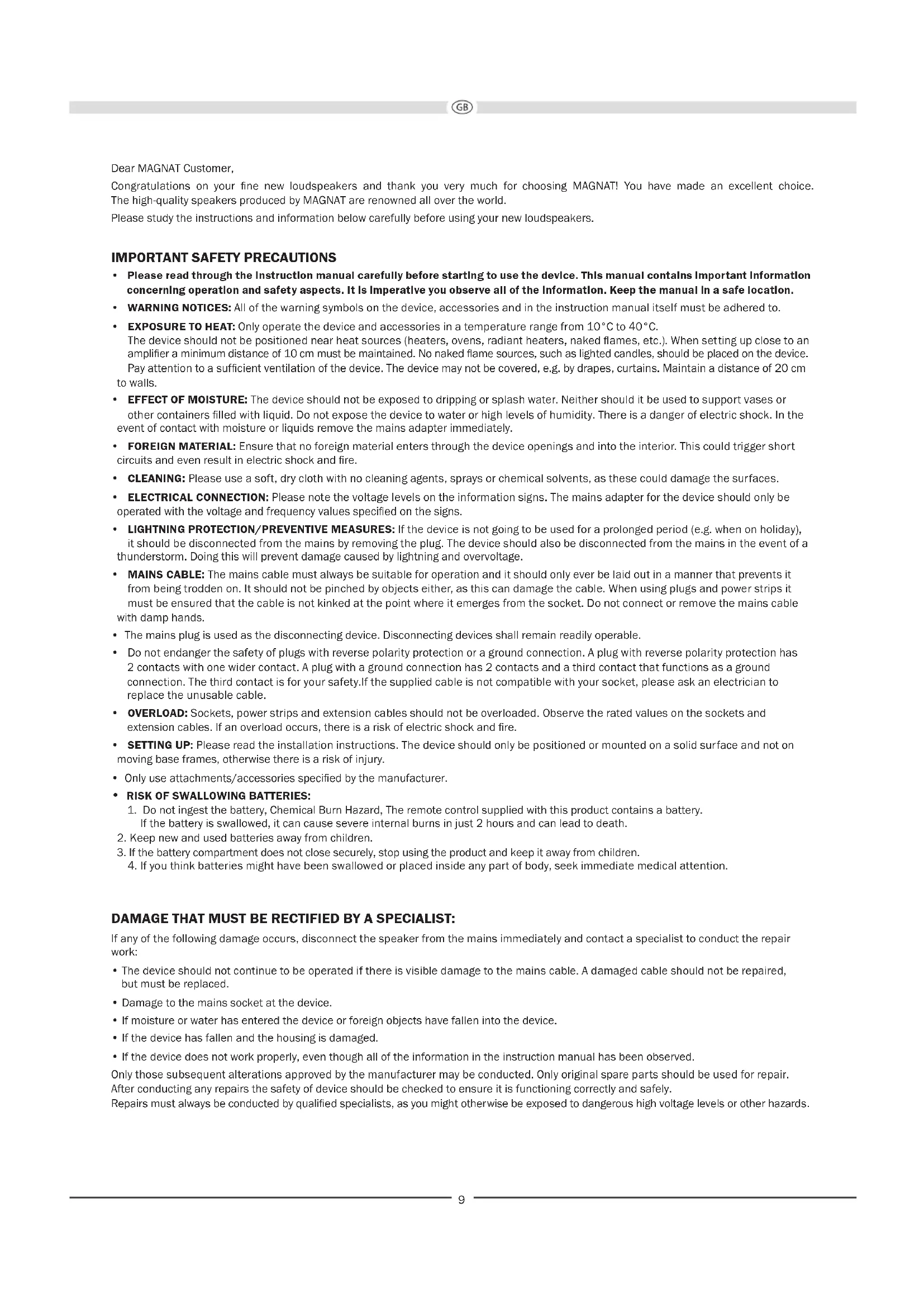 DAMAGE THAT MUST BE RECTIFIED BY A SPECIALIST: If any of the following damage occurs, disconnect the speaker from the mains immediately and contact a specialist to conduct the repair work: