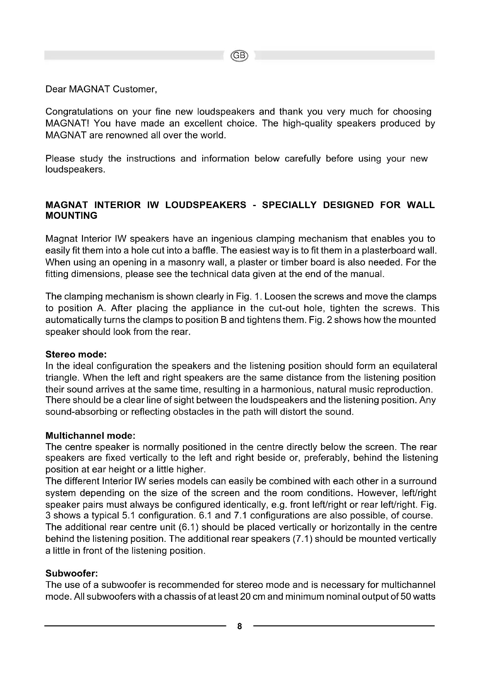 Dear MAGNAT Customer, Congratulations on your fine new loudspeakers and thank you very much for choosing MAGNAT! You have made an excellent choice. The high-quality speakers produced by MAGNAT are renowned all over the world. Please study the instructions and information below carefully before using your new loudspeakers. MAGNAT INTERIOR IW LOUDSPEAKERS - SPECIALLY DESIGNED FOR WALL MOUNTING Magnat Interior IW speakers have an ingenious clamping mechanism that enables you to easily fit them into a hole cut into a baffle. The easiest way is to fit them in a plasterboard wall. When using an opening in a masonry wall, a plaster or timber board is also needed. For the fitting dimensions, please see the technical data given at the end of the manual. The clamping mechanism is shown clearly in Fig. 1. Loosen the screws and move the clamps to position A. After placing the appliance in the cut-out hole, tighten the screws. This automatically turns the clamps to position B and tightens them. Fig. 2 shows how the mounted speaker should look from the rear. Stereo mode: In the ideal configuration the speakers and the listening position should form an equilateral triangle. When the left and right speakers are the same distance from the listening position their sound arrives at the same time, resulting in a harmonious, natural music reproduction. There should be a clear line of sight between the loudspeakers and the listening position. Any sound-absorbing or reflecting obstacles in the path will distort the sound. Multichannel mode: The centre speaker is normally positioned in the centre directly below the screen. The rear speakers are fixed vertically to the left and right beside or, preferably, behind the listening position at ear height or a little higher. The different Interior IW series models can easily be combined with each other in a surround system depending on the size of the screen and the room conditions. However, left/right speaker pairs must always be configured identically, e.g. front left/right or rear left/right. Fig. 3 shows a typical 5.1 configuration. 6.1 and 7.1 configurations are also possible, of course. The additional rear centre unit (6.1) should be placed vertically or horizontally in the centre behind the listening position. The additional rear speakers (7.1) should be mounted vertically a little in front of the listening position. Subwoofer: The use of a subwoofer is recommended for stereo mode and is necessary for multichannel mode. All subwoofers with a chassis of at least 20 cm and minimum nominal output of 50 watts9