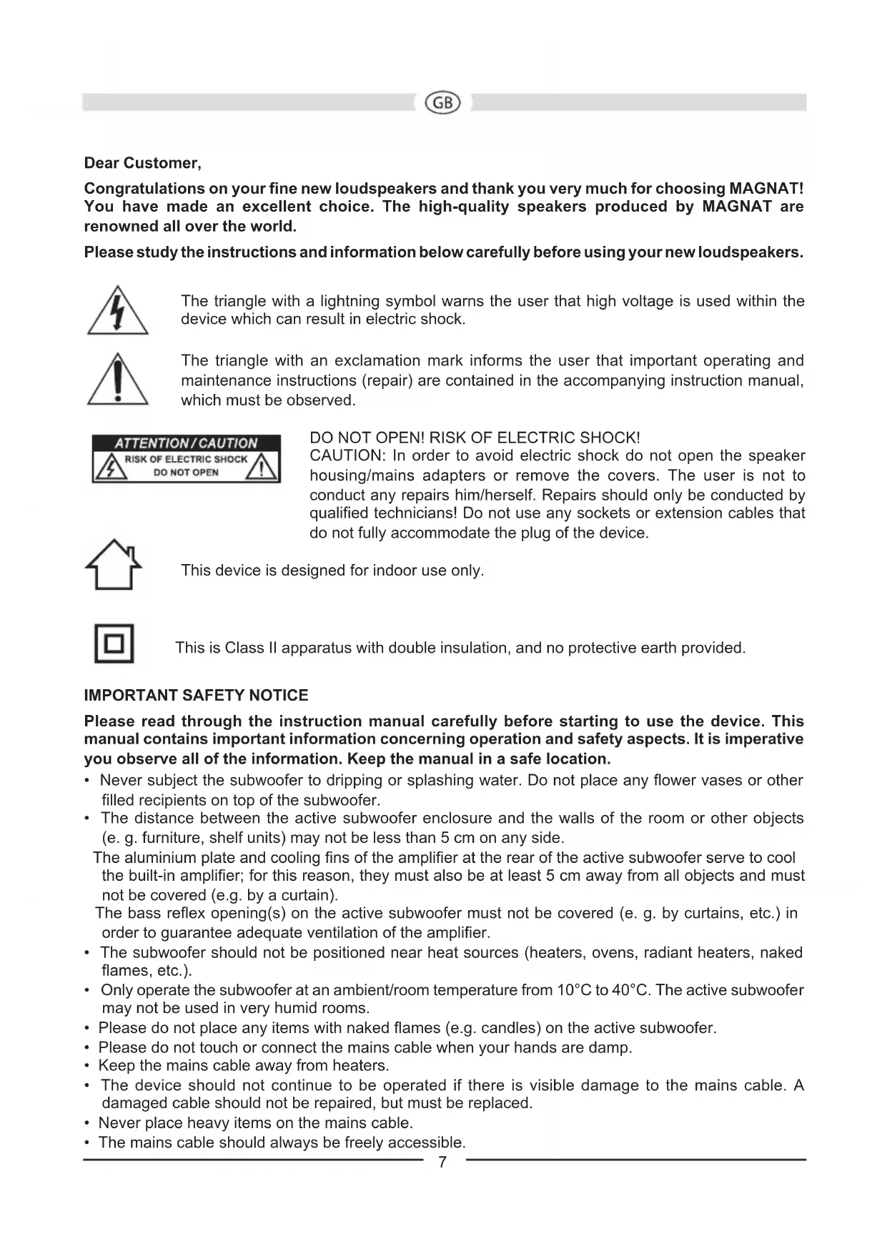- Folgeschäden an fremden Geräten • Kostenerstattung bei Schadensbehebung durch Dritte ohne unser vorheriges Einverständnis. Congratulations! You have made a wise selection in becoming the owner of a MAGNAT HiFi equipment. Due to high quality MAGNAT HiFi products have earned an excellent reputation through the western world. And this high quality standard enables us to grant a 5-years warranty for MAGNAT HiFi speakers and a 2-years warranty for MAGNAT HiFi-electronic components. The equipments are checked and tested continously during the entire production process. In case you have problems with your MAGNAT HiFi equipment, kindly observe the following: