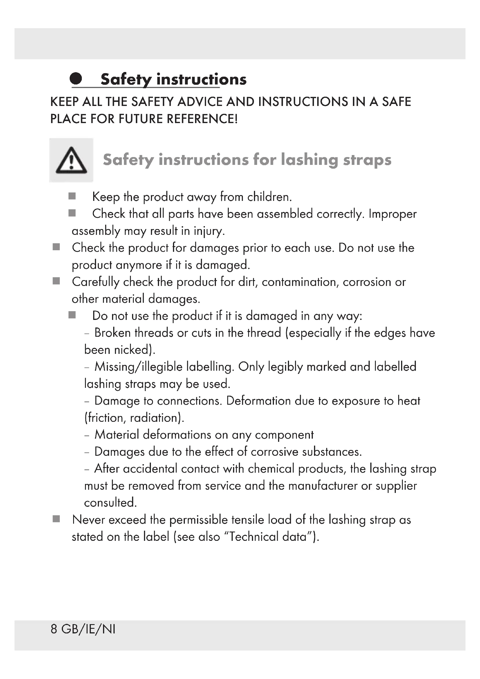25daN) Material: Polyester (PES)8 GB/IE/NI Safety instructions KEEP ALL THE SAFETY ADVICE AND INSTRUCTIONS IN A SAFE PLACE FOR FUTURE REFERENCE! Safety instructions for lashing straps Keep the product away from children. Check that all parts have been assembled correctly. Improper assembly may result in injury. Check the product for damages prior to each use. Do not use the product anymore if it is damaged. Carefully check the product for dirt, contamination, corrosion or other material damages. Do not use the product if it is damaged in any way: – Broken threads or cuts in the thread (especially if the edges have been nicked). – Missing/illegible labelling. Only legibly marked and labelled lashing straps may be used. – Damage to connections. Deformation due to exposure to heat (friction, radiation). – Material deformations on any component – Damages due to the effect of corrosive substances. – After accidental contact with chemical products, the lashing strap must be removed from service and the manufacturer or supplier consulted. Never exceed the permissible tensile load of the lashing strap as stated on the label (see also “Technical data”).9GB/IE/NI Choose the most suitable lashing strap in accordance with the intended load that needs to be lashed down, the tensile load and loading surface (see label). Check that the vehicle parts you wish to strap the load to are sturdy enough. Make sure that the lashing straps are not twisted/knotted and that the load is distributed across their entire width. Keep lashing strap away from hot surfaces. Evenly distribute the lashing straps on the load to be secured. Never use the lashing straps to lift loads.