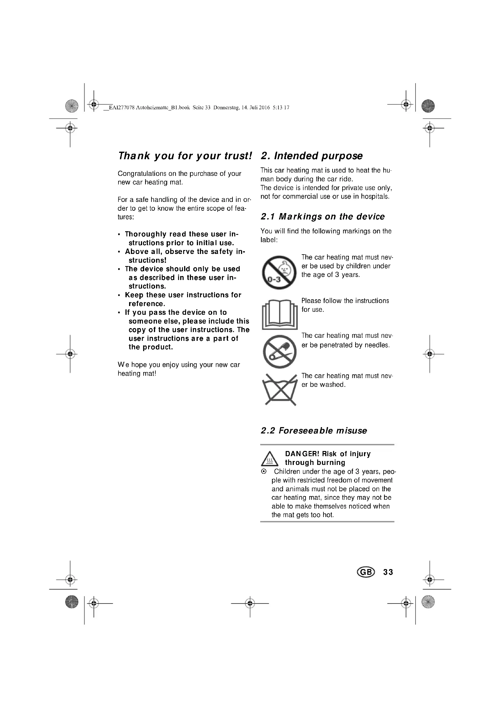 DANGER for children ~ Children must not play with packing ma- terial. Do not allow children to play with plastic bags. There is a risk of suffoca- tion. ~ Keep the device out of the reach of chil- dren. General ~ In order to avoid property damage, mind the following provisions: never use any abrasive, corrosive or scratching cleaning agents. ~ Please take note that every claim under warranty and liability expires if accesso- ries are used, which are not recom- mended in these user instructions or if spare parts used for repairs are not ex- clusively original spare parts. This also applies to repairs performed by unqual- ified persons. ~ In case of possible malfunctions during the warranty period, the repair of the device must always be performed by our Service Center. Otherwise any war- ranty claim expires. ~ Ensure that the cable of the vehicle plug will never turn into a trip hazard or that somebody becomes entangled in the same or is able to step on it. ~ The device must only be operated under supervision. Major damage such as overheating usually makes itself known by odour development. ~ If the device is powered via the ciga- rette lighter socket for an extended peri- od of time, ensure that the car battery will never be discharged completely in the process. ~ The device must not be operated close to heat sources, or in direct sunlight to prevent overheating. DANGER! Risk of electric shock ~ Never use the device or parts thereof if it is damaged. In this case, have the de- vice repaired by qualified personnel. ~ The device must never be penetrated by water or other liquids. Therefore: - never use outdoors; - never use in a very moist environ- ment; - never use the device to deposit bever- ages or other liquids; - always keep the vehicle cable away from moisture. ~ If, nevertheless, liquid should penetrate the device, disconnect the power con- nector immediately and have the device repaired by qualified personnel. ~ Should the device not be used for an ex- tended period of time, disconnect the vehicle cable. Only then is the device completely de-energised and protected against accidental starting. DANGER in road traffic ~ For vehicles with side airbags, the up- per fastening belt may only be used to a limited extent (see “Fastening the car heating mat” on page 36). ~ Ensure that the heat will not make you drowsy. Otherwise switch off the car heating mat immediately and take a break. ~ In case of questions regarding the air- bag, read the user instructions of your vehicle and or ask your vehicle repair shop. ~ Never operate the device in the car dur- ing the ride. The possible distraction may endanger road safety. If you would like to change the settings, stop the car to do so.