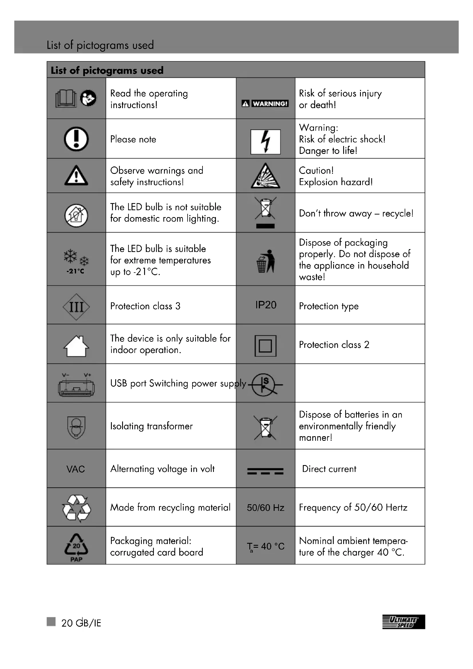 Risk of electric shock! Danger to life! Observe warnings and safety instructions! Caution! Explosion hazard! The LED bulb is not suitable for domestic room lighting. Don’t throw away – recycle! -21°C The LED bulb is suitable for extreme temperatures up to -21°C. Dispose of packaging properly. Do not dispose of the appliance in household waste! Protection class 3 IP20 Protection type The device is only suitable for indoor operation. Protection class 2 USB port Switching power supply Isolating transformer Dispose of batteries in an environmentally friendly manner! VAC Alternating voltage in volt Direct current Made from recycling material 50/60 Hz Frequency of 50/60 Hertz Packaging material: corrugated card board