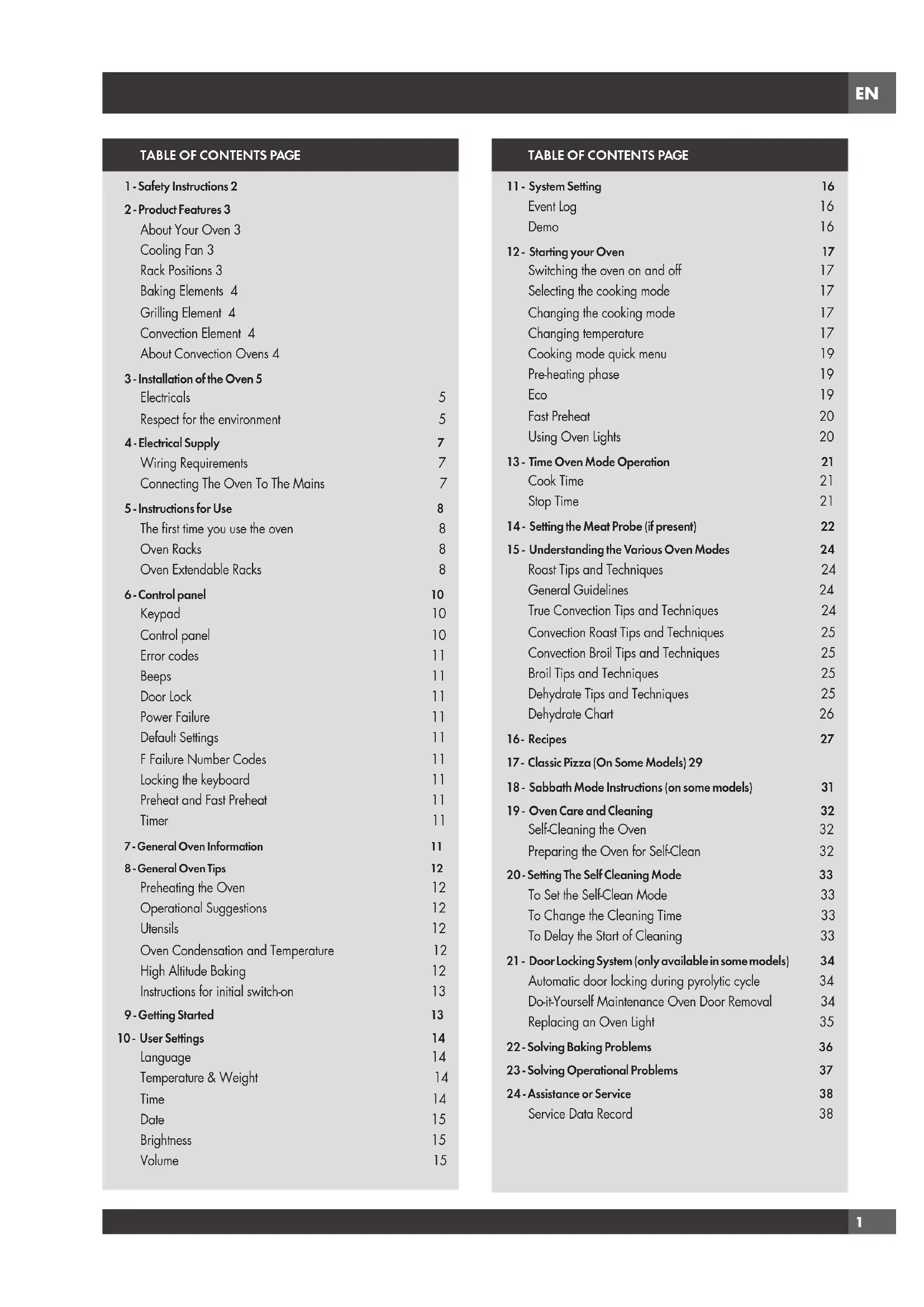 18 - Sabbath Mode Instructions (on some models) 31