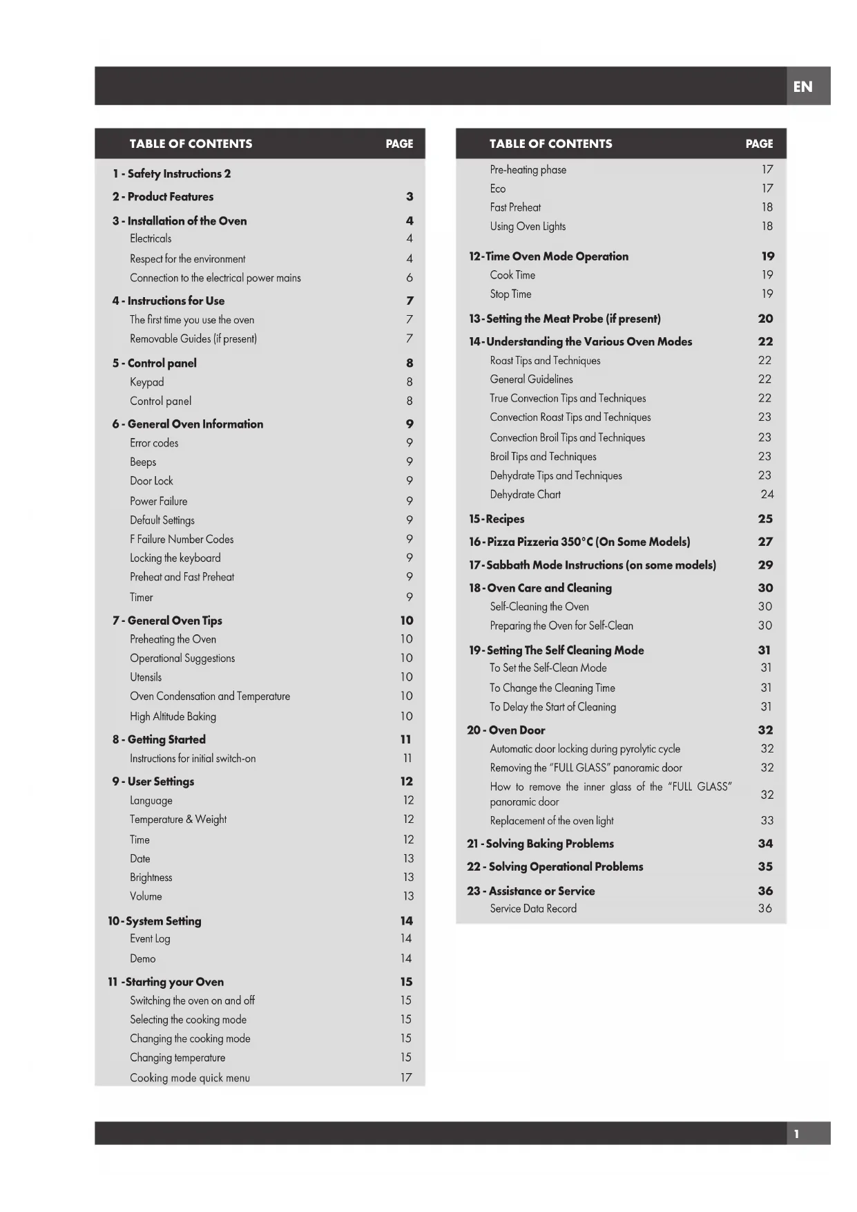 Before contacting service, check the following to avoid unnecessary service charges. Oven Problem Problem Solving Steps Error F1030* or F2030* appears in the display window. A problem with latch mechanism occurred. Remove power and turn it back on again after a few seconds. The oven should run a latch auto– test. If condition persists, note the code number (in the EVENT LOG list) and contact service. Other F__ Error appears in the display window. Remove power and turn it back on again after a few seconds. If condition persists, note the code number (in the EVENT LOG list) and contact service. The oven display stays OFF Turn off power at the main power supply (fuse or breaker box). Turn breaker back on. If condition persists, call an authorized service. Cooling fan continues to run after oven is turned off The fan turns off automatically when the electronic components have cooled sufficiently. Oven door is locked and will not release, even after cooling Turn the oven off at the circuit breaker and wait a few seconds. Turn breaker back on. The oven should reset itself and will be operable. Oven is not heating Check the circuit breaker or fuse box to your house. Make sure there is proper electrical power to the oven. Make sure the oven temperature has been selected. Oven is not cooking evenly Refer to cooking charts for recommended rack position. Always reduce recipe temperature by 25°F (15°C) when baking with Convection Bake mode. Oven light is not working properly Replace or reinsert the light bulb if loose or defective. See Page 33. Avoid touching the bulb glass with bare fingers as finger oil may cause bulbs to burn out prematurely. Oven light stays on Check for obstruction in oven door. Check to see if hinge is bent or door switch broken. Oven will not Self-Clean properly Allow the oven to cool before running Self-Clean. Always wipe out loose soils or heavy spill-over before running Self-Clean. If oven is badly soiled, set oven for a four-hour Self-Clean. See Preparing the Oven to Self-Clean, Page 31. Clock and timer are not working properly Make sure there is proper electrical power to the oven. See the Clock sections on Page12. Excessive moisture When using Bake mode, preheat the oven first. Convection Bake and Convection Roast will eliminate any moisture in oven (this is one of the advantages of convection). Porcelain chips When oven racks are removed and replaced, always tilt racks upward and do not force them to avoid chipping the porcelain.EN
