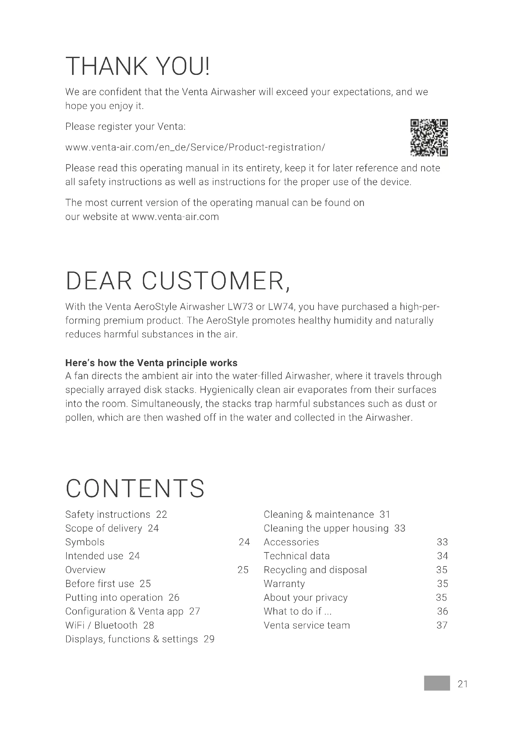 +41 41 781 15 15, www.venta-air.com21EN DEAR CUSTOMER, With the Venta AeroStyle Airwasher LW73 or LW74, you have purchased a high-per- forming premium product. The AeroStyle promotes healthy humidity and naturally reduces harmful substances in the air. Here’s how the Venta principle works A fan directs the ambient air into the water-filled Airwasher, where it travels through specially arrayed disk stacks. Hygienically clean air evaporates from their surfaces into the room. Simultaneously, the stacks trap harmful substances such as dust or pollen, which are then washed off in the water and collected in the Airwasher. THANK YOU! We are confident that the Venta Airwasher will exceed your expectations, and we hope you enjoy it. Please register your Venta: www.venta-air.com/en_de/Service/Product-registration/ Please read this operating manual in its entirety, keep it for later reference and note all safety instructions as well as instructions for the proper use of the device. The most current version of the operating manual can be found on our website at www.venta-air.com CONTENTS Safety instructions 22 Scope of delivery 24 Symbols 24 Intended use 24 Overview 25 Before first use 25 Putting into operation 26 Configuration & Venta app 27 WiFi / Bluetooth 28 Displays, functions & settings 29 Cleaning & maintenance 31 Cleaning the upper housing 33 Accessories 33 Technical data 34 Recycling and disposal 35 Warranty 35 About your privacy 35 What to do if ... 36 Venta service team 3722 EN