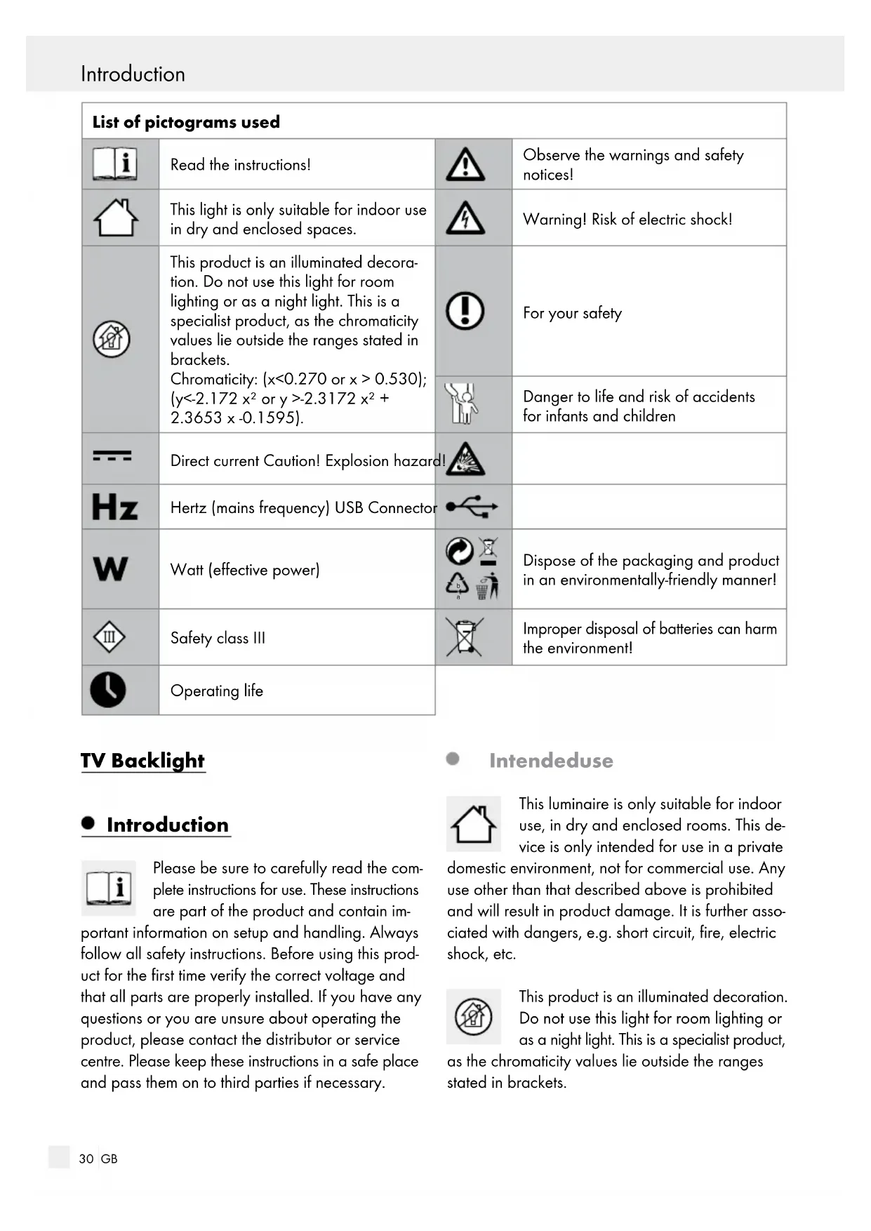 mproper disposal of batteries can harm the environment! Operating life TV Backlight Introduction Please be sure to carefully read the com- plete instructions for use. These instructions are part of the product and contain im- portant information on setup and handling. Always follow all safety instructions. Before using this prod- uct for the first time verify the correct voltage and that all parts are properly installed. If you have any questions or you are unsure about operating the product, please contact the distributor or service centre. Please keep these instructions in a safe place and pass them on to third parties if necessary. Intended use This luminaire is only suitable for indoor use, in dry and enclosed rooms. This de- vice is only intended for use in a private domestic environment, not for commercial use. Any use other than that described above is prohibited and will result in product damage. It is further asso- ciated with dangers, e.g. short circuit, fire, electric shock, etc. This product is an illuminated decoration. Do not use this light for room lighting or as a night light. This is a specialist product, as the chromaticity values lie outside the ranges stated in brackets. Introduction Introduction / Safety31 GB Chromaticity: (x<0.270 or x > 0.530); (y<-2.172 x² or y >-2.3172 x² + 2.3653 x -0.1595). Scope of delivery Check immediately after unpacking that the parts are complete and that the product is in proper condition. 1 LED strip with USB connector 3 LED strips 3 Connectors 3 Direct connectors 1 Remote control 1 Cable holder 1 Adhesive strip 1 Set of assembly instructions and instructions for use Parts Description