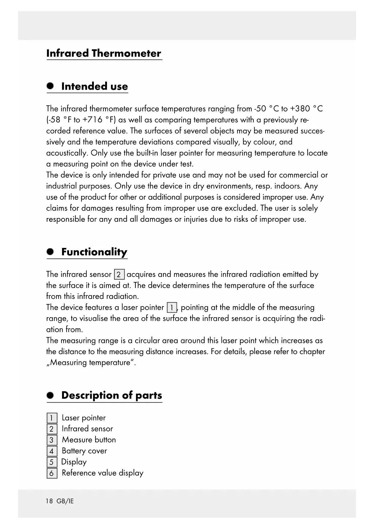 9 V block battery Scope of delivery 1 Infrared thermometer 1 9 V block battery 1 Set of instructions for use Technical Data Power supply: 1 x 9 V block battery (type 6F22 or 6LR61) Measuring range: -50 °C to +380 °C (-58 °F to +716 °F) Measurement accuracy for T > 0 °C: ± 1.5 °C or ±1.5% of the measurement Measurement accuracy for T < 0 °C: ± 3 °C or ±3% of the measurement Laser class: 2 Laser wavelength: 650 nm Laser output power: <1 mW Operating temperature: 0 °C to 40 °C Humidity: ≤ 75 % Dimensions: approx. 18 x 12 x 4.2 cm Weight without battery: approx. 170 g Safety instructions Before using the product, please familiarise yourself with all of the safety information and instructions for use! When passing this product on to others, please also include all the documents!20 GB/IE Danger from laser radiation LASER RADIATION