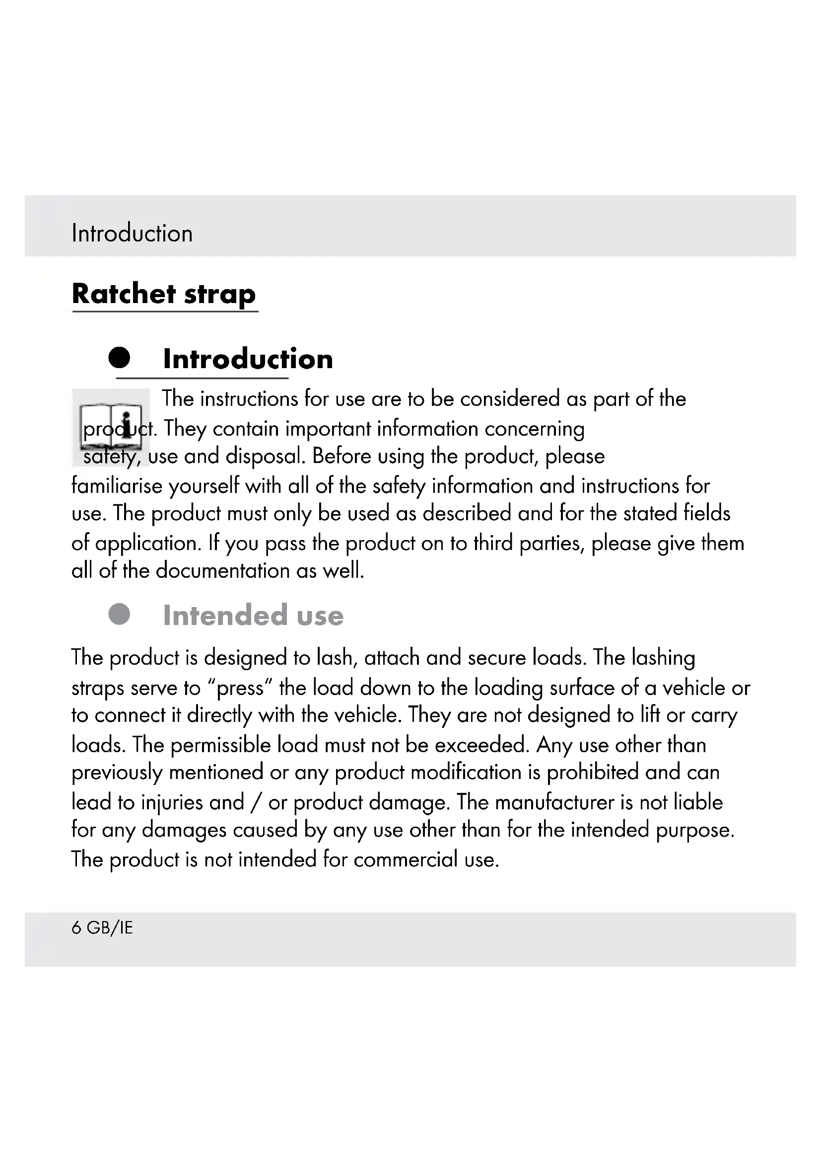 1235GB/IE Table of Contents Introduction......................................................................Page 6 Intended use ...........................................................................Page 6 Description of parts ................................................................Page 7 Technical data ........................................................................Page 7 Scope of delivery ...................................................................Page 7 Safety instructions......................................................Page 8 General safety instructions ....................................................Page 8 Safety instructions for lashing straps .....................................Page 9 Practical information regarding the use and care of lashing straps ...................................Page 13 Use ...........................................................................................Page 16 Attaching the lashing strap ....................................................Page 16 Releasing the lashing strap ....................................................Page 17 Cleaning and care ....................................................... Page 18 Disposal ............................................................................... Page 196 GB/IE Introduction Ratchet strap Introduction The instructions for use are to be considered as part of the product. They contain important information concerning safety, use and disposal. Before using the product, please familiarise yourself with all of the safety information and instructions for use. The product must only be used as described and for the stated fields of application. If you pass the product on to third parties, please give them all of the documentation as well. Intended use The product is designed to lash, attach and secure loads. The lashing straps serve to “press“ the load down to the loading surface of a vehicle or to connect it directly with the vehicle. They are not designed to lift or carry loads. The permissible load must not be exceeded. Any use other than previously mentioned or any product modification is prohibited and can lead to injuries and / or product damage. The manufacturer is not liable for any damages caused by any use other than for the intended purpose. The product is not intended for commercial use.7GB/IE Introduction Description of parts