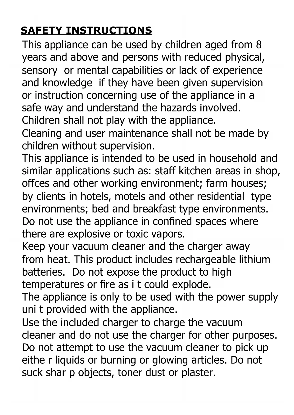 Marque CONTINENTAL EDISON Réf CEVCBSFPB Modèle EV-660-S185-22 Voltage 18.5V Temps de charge 3 à 4 heures.- Les équipements électriques et électroniques font l'objet d'une collecte sélective. - Ne pas se débarrasser des déchets d’équipements électriques et électroniques avec les déchets municipaux non triés, mais procéder à leur collecte sélective.SAFETY INSTRUCTIONS This appliance can be used by children aged from 8 years and above and persons with reduced physical, sensory or mental capabilities or lack of experience and knowledge if they have been given supervision or instruction concerning use of the appliance in a safe way and understand the hazards involved. Children shall not play with the appliance. Cleaning and user maintenance shall not be made by children without supervision. This appliance is intended to be used in household and similar applications such as: staff kitchen areas in shop, offces and other working environment; farm houses; by clients in hotels, motels and other residential type environments; bed and breakfast type environments. Do not use the appliance in confined spaces where there are explosive or toxic vapors. Keep your vacuum cleaner and the charger away from heat. This product includes rechargeable lithium batteries. Do not expose the product to high temperatures or fire as i t could explode. The appliance is only to be used with the power supply uni t provided with the appliance. Use the included charger to charge the vacuum cleaner and do not use the charger for other purposes. Do not attempt to use the vacuum cleaner to pick up eithe r liquids or burning or glowing articles. Do not suck shar p objects, toner dust or plaster.Do not use the machine in a damp environment or outdoors. The unit is intended for domestic use only. Store the machine in a dry place. If any blockage is found in brush, the appliance can be re-operated only after the blockage is cleaned away. Do not store or use the appliance close to high temperature places. Do not let children use the appliance. Keep infants away from the unit. Do not use the machine if the charger, the power cord or other parts of the machine are damaged. Have the machin e repaired by an authorized technician. Never immerse the device in water! Do not use aggressive chemicals, abrasives or solvents such as benzene to clean the machine. Never leave the appliance unattended during use. The machine should not be operated by means of anexternal timer-switch or by means of a separate system with remote control. The appliance’s plug must fit into the mains socket properly . Do not alter the plug. Do not use plug adaptors. Do not touch the plug with wet hands. Disconnect the battery charger from the mains when not in use and before undertaking any cleaning task. Do not force the appliance’s work capacity. Stop using the machine once the dust contanior is full. Do not use the appliance if the filter is not correctlyin place. Do not use the appliance if the accessories or parts are not fastened together properly. Do not open the batteries under any circumstances whatsoever. The batteries should be stored at a temperature of below 40℃. Make sure that dust, dirt or other foreign objects do not block the fan grill on the appliance. This appliance must only be supplied at safety extra low voltage corresponding to the marking on the appliance.PARTS DESCRIPTION