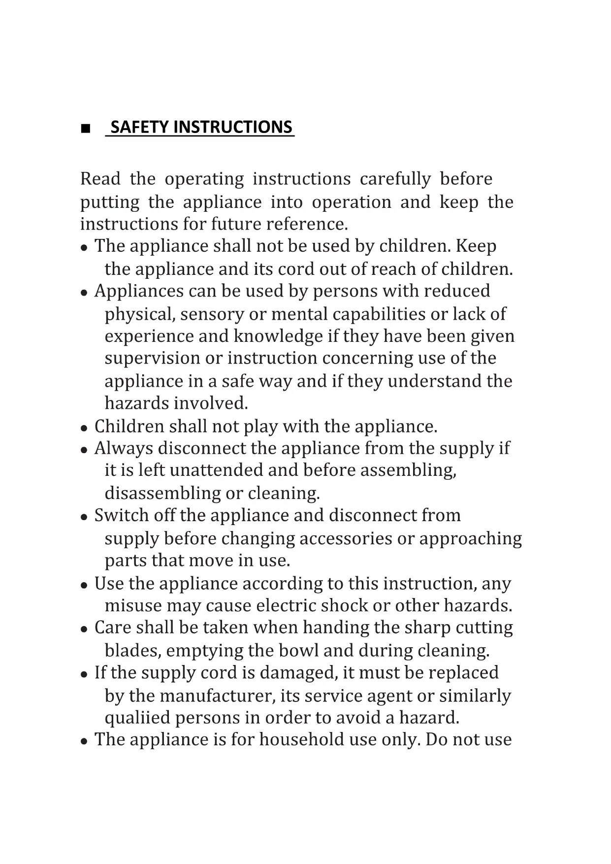 Manuel d’instructions - Instruction Manual■ SAFETY INSTRUCTIONS Read the operating instructions carefully before putting the appliance into operation and keep the instructions for future reference. The appliance shall not be used by children. Keep the appliance and its cord out of reach of children. Appliances can be used by persons with reduced physical, sensory or mental capabilities or lack of experience and knowledge if they have been given supervision or instruction concerning use of the appliance in a safe way and if they understand the hazards involved. Children shall not play with the appliance. Always disconnect the appliance from the supply if it is left unattended and before assembling, disassembling or cleaning. Switch off the appliance and disconnect from supply before changing accessories or approaching parts that move in use. Use the appliance according to this instruction, any misuse may cause electric shock or other hazards. Care shall be taken when handing the sharp cutting blades, emptying the bowl and during cleaning. If the supply cord is damaged, it must be replaced by the manufacturer, its service agent or similarly qualified persons in order to avoid a hazard. The appliance is for household use only. Do not useoutdoors. Never dip machine into any liquid and sharp edges. Do not use the appliance with wet hands. If the appliance is humid or wet, unplug it immediately. Keep your finger away from moving parts and fitted tools. Never put your fingers etc in hinge mechanism. Use only original spare parts. In order to ensure your children’s safety, please keep all packaging (plastic bags, boxes, polystyrene etc.) out of their reach. Do not insert anything into the rotating hooks while the machine is working. Place the machine on a smooth, flat and stable working surface. Never pour the water more than the maximum water level. Wait until the moving parts stop running before you remove the lid of machine. Be careful if hot liquid is poured into machine as it can be ejected out of the appliance due to a sudden steaming. About how to clean surfaces in contact with food, please refer to the section “CLEANING”.■ BEFORE CONNECTING TO POWER Before connecting to the power, recheck the type of supply and the mains voltage match with the details given on the rating label on the appliance. Using for the first time, rip off all wrapping paper and plastic bags. Clean the fittings.