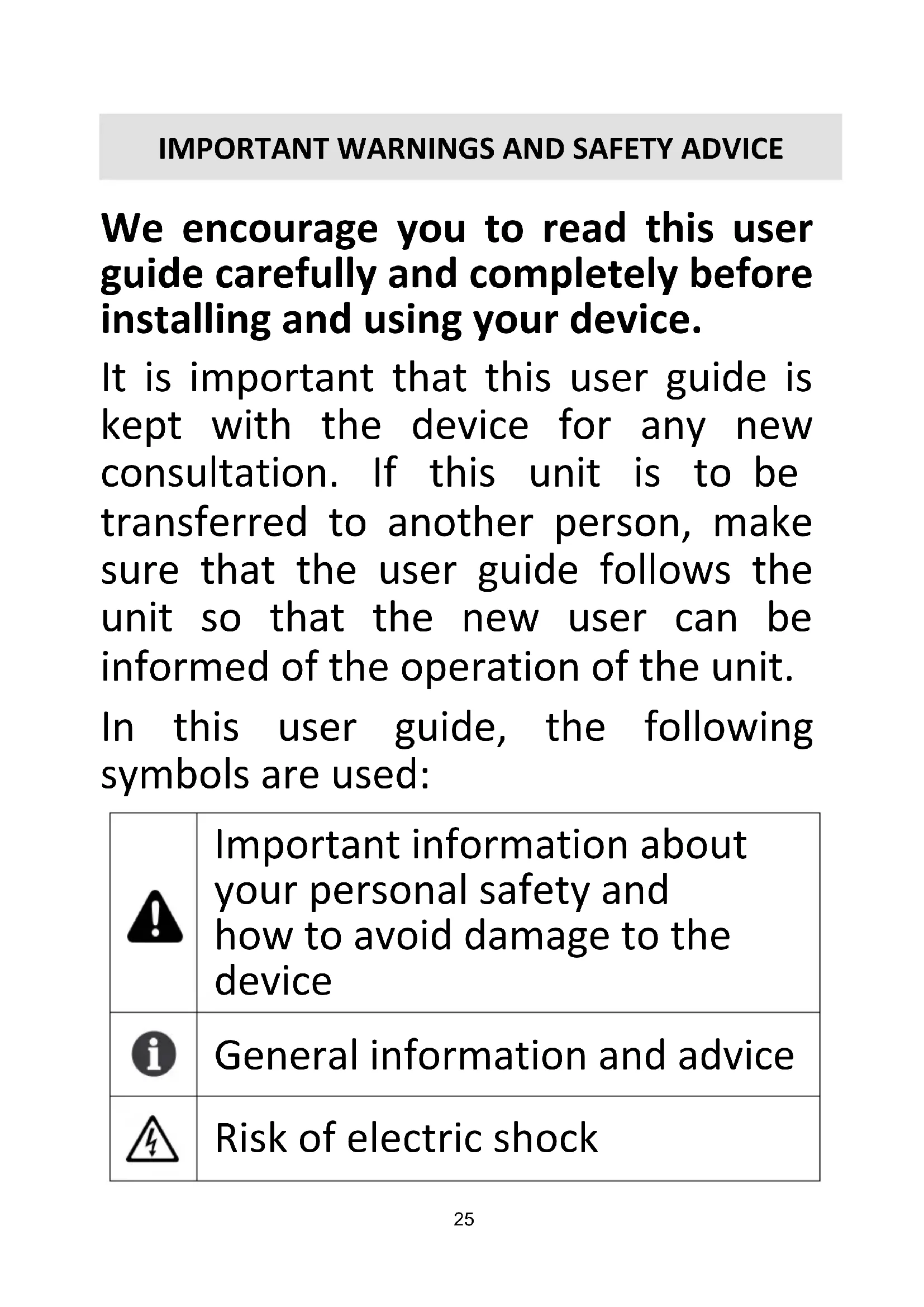 We encourage you to read this user guide carefully and completely before installing and using your device. It is important that this user guide is kept with the device for any new consultation. If this unit is to be transferred to another person, make sure that the user guide follows the unit so that the new user can be informed of the operation of the unit. In this user guide, the following symbols are used: Important information about your personal safety and how to avoid damage to the device General information and advice Risk of electric shock