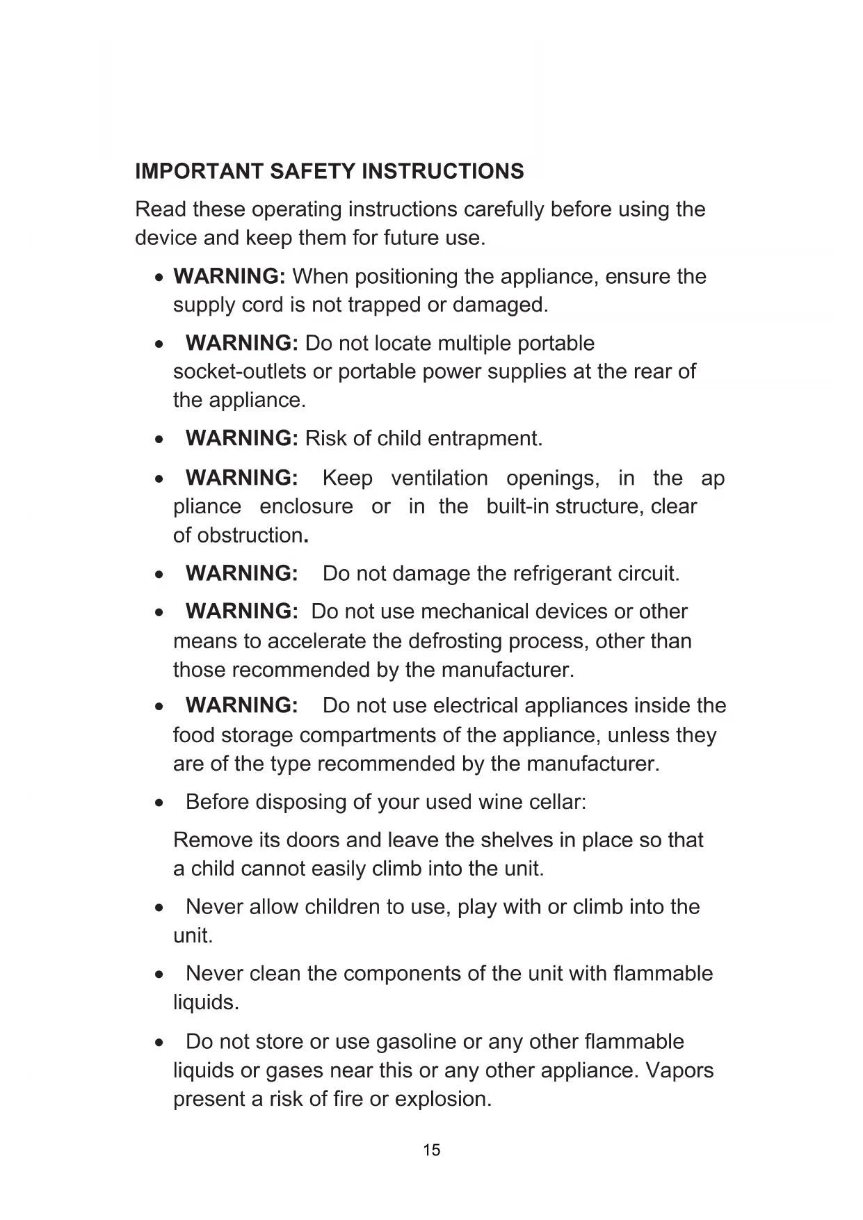 Read these operating instructions carefully before using the device and keep them for future use. x WARNING: When positioning the appliance, ensure the supply cord is not trapped or damaged. x WARNING: Do not locate multiple portable socket-outlets or portable power supplies at the rear of the appliance. x WARNING: Risk of child entrapment. x WARNING: Keep ventilation openings, in the ap pliance enclosure or in the built-in structure, clear of obstruction. x WARNING: Do not damage the refrigerant circuit. x WARNING: Do not use mechanical devices or other means to accelerate the defrosting process, other than those recommended by the manufacturer. x WARNING: Do not use electrical appliances inside the food storage compartments of the appliance, unless they are of the type recommended by the manufacturer. x Before disposing of your used wine cellar: Remove its doors and leave the shelves in place so that a child cannot easily climb into the unit. x Never allow children to use, play with or climb into the unit. x Never clean the components of the unit with flammable liquids. x Do not store or use gasoline or any other flammable liquids or gases near this or any other appliance. Vapors present a risk of fire or explosion. x To clean your wine cellar, do not use abrasive cleaners or solvents. Glass cleaners or soapy water give excellent results. Symbol ISO 7010 W021 This symbolmeansthat a ĮƌĞŚĂnjĂƌĚĞxists. x Leave 10cm of free space at the back of the unit to allow for ventilation of the cooling system. x In order to store your wines at a stable temperature, avoid leaving the door open for too long. x Do not install your wine cellar near a heat source and avoid direct sunlight. x Install your cellar on a flat, clean and stable floor. x Do not install any other electrical equipment on your cellar. x To ensure your safety, do not place your cellar in damp places. x Do not store perishable food in this appliances as the indoor temperature may not be cold enough for proper storage. x This appliance is intended to be used in household and similar applications but not in the following cases: – staff kitchen areas in shops, offices and other working environments; – farm houses and by clients in hotels, motels and other residential type environments; – bed and breakfast type environments; – catering and similar non-retail applications. x This device is designed for use inside a house or apartment. It is essential that the temperature of the room in which it is used is not lower than10° C or higher than 38°C for optimal use. x Children aged from 3 to 8 years are allowed to load and unload refrigerating appliances. x This device may be used by children 8 years of age or older and by persons with reduced physical, sensory or mental abilities or lack of experience or knowledge, if they are properly supervised, experience or knowledge, if they are properly supervised or instructions on the safe use of the device have been given to them and the risks involved have been addressed. x Children shall not play with the appliance. x Cleaning and user maintenance shall not be made by children without supervision. x To avoid contamination of food, please respect the following instructions: - Opening the door for long periods can cause a significant increase of the temperature in the compartments of the appliance. - Clean regularly surfaces that can come in contact with food and accessible drainage systems.