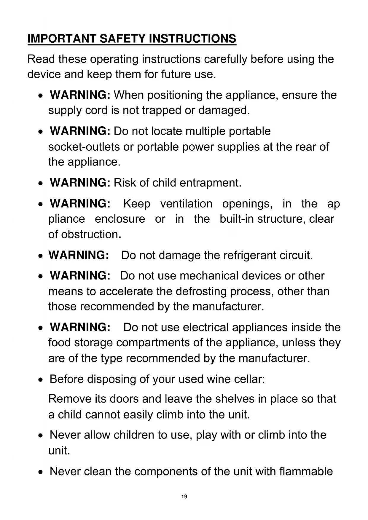 - Before disposing of your used wine cellar: Remove its doors and leave the shelves in place so that a child cannot easily climb into the unit.