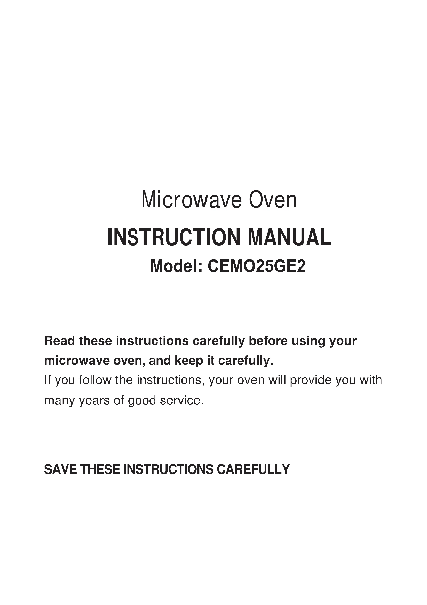 Read these instructions carefully before using your microwave oven, and keep it carefully. If you follow the instructions, your oven will provide you with many years of good service. INSTRUCTION MANUAL Microwave Oven Model: CEMO25GE2Important Safety Instructions To reduce the risk of fire, electric shock, personal injury and excessive exposure to microwave energy when using the device, observe a number of basic precautions, including which: