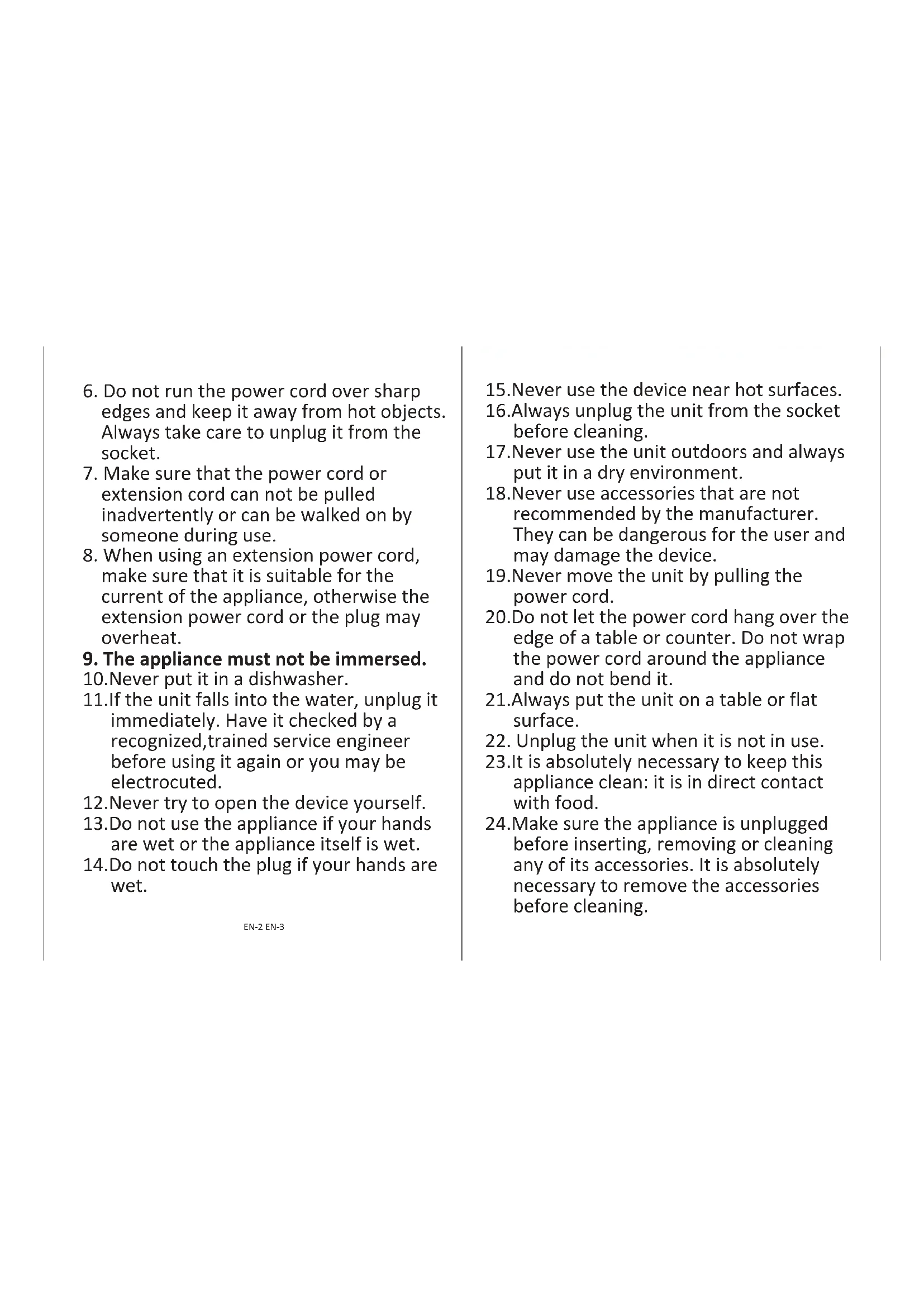 10.Never put it in a dishwasher. 11.If the unit falls into the water, unplug it immediately. Have it checked by a recognized,trained service engineer before using it again or you may be electrocuted. 12.Never try to open the device yourself. 13.Do not use the appliance if your hands are wet or the appliance itself is wet. 14.Do not touch the plug if your hands are wet. 15.Never use the device near hot surfaces. 16.Always unplug the unit from the socket before cleaning. 17.Never use the unit outdoors and always put it in a dry environment. 18.Never use accessories that are not recommended by the manufacturer. They can be dangerous for the user and may damage the device. 19.Never move the unit by pulling the power cord. 20.Do not let the power cord hang over the edge of a table or counter. Do not wrap the power cord around the appliance and do not bend it. 21.Always put the unit on a table or flat surface.