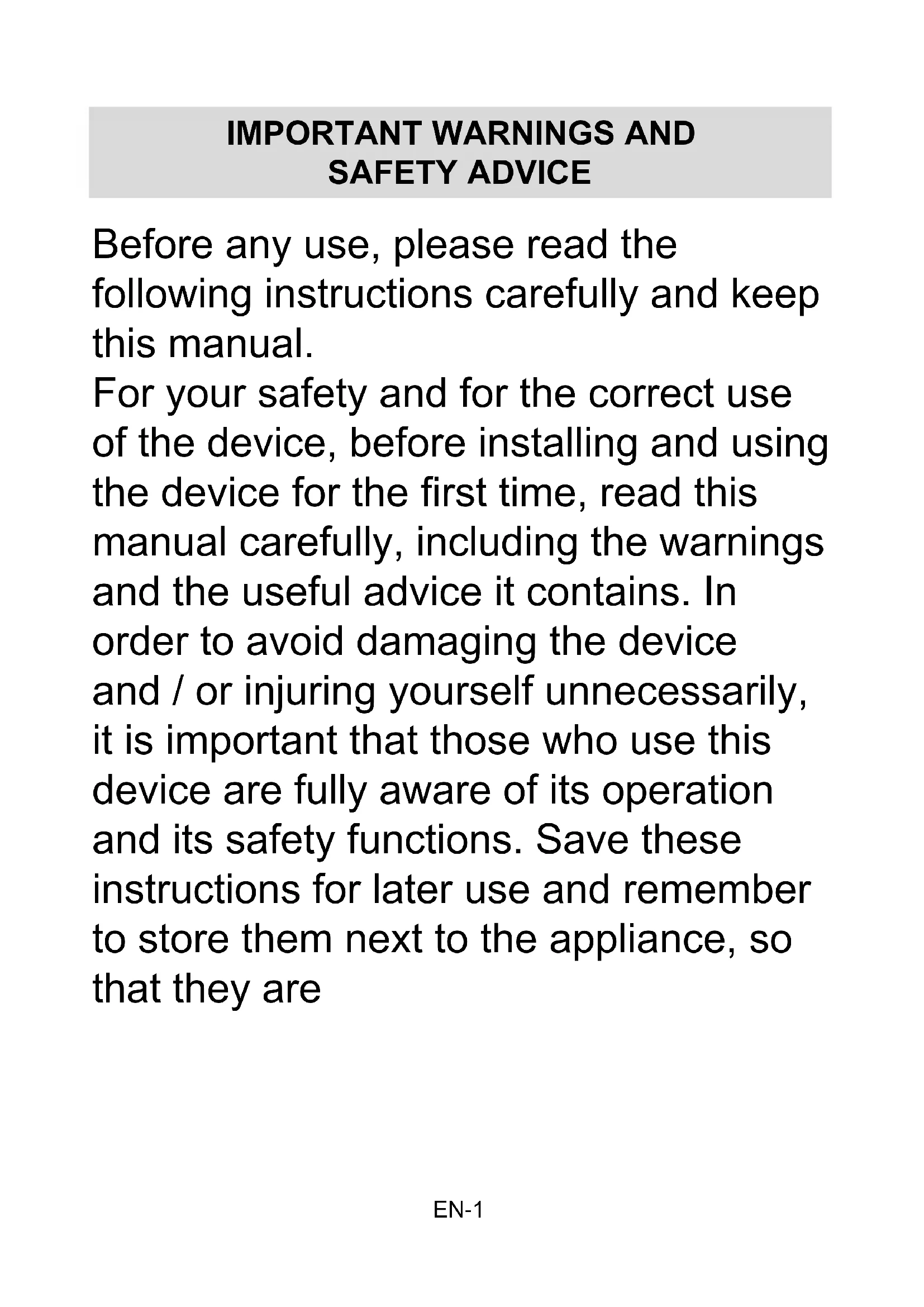 SAFETY ADVICE Before any use, please read the following instructions carefully and keep this manual. For your safety and for the correct use of the device, before installing and using the device for the first time, read this manual carefully, including the warnings and the useful advice it contains. In order to avoid damaging the device and / or injuring yourself unnecessarily, it is important that those who use this device are fully aware of its operation and its safety functions. Save these instructions for later use and remember to store them next to the appliance, so that they areEN-2 Important information about your personal safety and how to avoid damaging the device. General information and advice Risk of electric shock Do not use electrical devices, such as a hairdryer or a heater to defrost your freezer. Containers containing flammable gases or liquids may leak at low temperatures. Do not store containers with flammable materials, such as aerosol cans, fire extinguishers, fire cartridges etc in the freezer.EN-3 Do not store carbonated or sparkling drinks in the freezer. Ice cream can cause "frost / gel burns" if eaten directly from the freezer. Do not remove items from the freezer compartment if your hands are wet / wet, as this may cause skin damage or "freezing burns". Bottles and cans should not be placed in the freezer compartment as they may burst when the freezer. The storage times recommended by the manufacturer must be observed. Refer to the relevant instructions. Do not allow children to tamper with the controls or play with the freezer. The freezer is heavy. Care should be taken when moving it.EN-4 t is dangerous to change the specifications or attempt to modify this product in any way. Do not store flammable gases or liquids inside your freezer. If the power cable is damaged, it must be replaced by the manufacturer, its service agent or a qualified person in order to avoid danger. This device can be used by children from 8 years old and people with reduced physical, sensory or mental capacities or a lack of experience and knowledge if they have received supervision or instructions concerning the use of the device. device safely and understand the dangers involved. Children should notEN-5 play with the device. Cleaning and user maintenance must not be carried out by children without supervision. The device is intended for use in domestic and similar places such as: