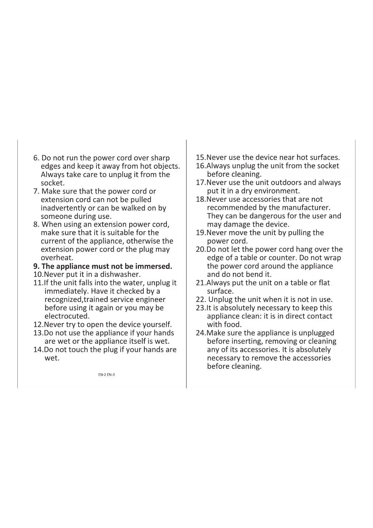 24.Make sure the appliance is unplugged before inserting, removing or cleaning any of its accessories. It is absolutely necessary to remove the accessories before cleaning.
