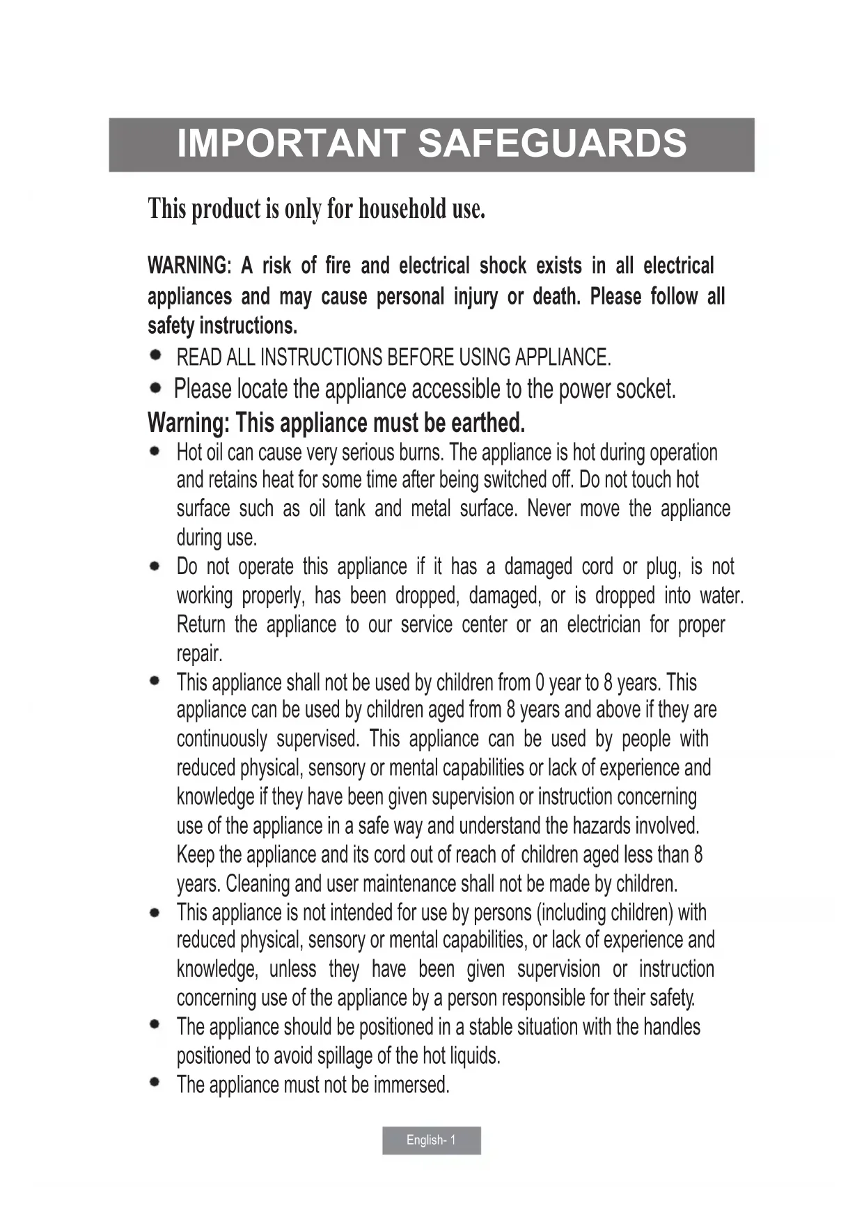 Hot oil can cause very serious burns. The appliance is hot during operation and retains heat for some time after being switched off. Do not touch hot surface such as oil tank and metal surface. Never move the appliance during use. Do not operate this appliance if it has a damaged cord or plug, is not working properly, has been dropped, damaged, or is dropped into water. Return the appliance to our service center or an electrician for proper repair. This appliance shall not be used by children from 0 year to 8 years. This appliance can be used by children aged from 8 years and above if they are continuously supervised. This appliance can be used by people with reduced physical, sensory or mental ca pabilities or lack of experience and knowledge if they have been given supervision or instruction concerning use of the appliance in a safe way and understand the hazards involved. Keep the appliance and its cord out of reach of children aged less than 8 years. Cleaning and user maintenance shall not be made by children. This appliance is not intended for use by persons (including children) with reduced physical, sensory or mental capabilities, or lack of experience and knowledge, unless they have been given supervision or instruction concerning use of the appliance by a person responsible for their safety. The appliance should be positioned in a stable situation with the handles positioned to avoid spillage of the hot liquids. The appliance must not be immersed. English- 1 IMPORTANT SAFEGUARDSmanufacturer may cause injuries and may damage the appliance. Do not use outdoors. Do not let the cord hang over edge of table or touch hot surfaces. Do not place on or near a hot gas or electric burner, or in a heated oven. Place the appliance on a lat surface that is resistant to heat. Always attach plug to the appliance first, then plug cord into the wall outlet. To disconnect, switch OFF, then remove plug from power outlet. Do not use the appliance for other than intended use. Be sure handle is properly assembled to basket and locked in place. To protect against electric shock, do not immerse the oil tank, the cord or the plug into water or other liquid. Damp food should be dried first. Remove any loose ice from frozen food. Lower the basket with food gently into the oil. Cover with lid during cooking of the food. Beware of oil spattering when food is put into the oil. English- 2 children and disabled persons. Do not operate unattended, and never leave the appliance unattended when connected to power outlet. Unplug the appliance from power outlet after use, before filling and emptying oil, and before cleaning. If the power cord of this appliance is damaged, it must only be replaced by an authorized service center. The use of accessory attachments is not recommended by the The appliance is not intended to be operated by means of an external timer or a separate remote-control system. This appliance is intended to be used in household and similar applications such as: – staff kitchen areas in shops, offices and other working environments; – farm houses; – by clients in hotels, motels and other residential type environments; – bed and breakfast type environments. : Caution, hot surface. The metal enclosure will get hot during use. Close supervision is necessary when the appliance is used by or nearEnglish- 3 Short Cord Instructions CAUTION: A short power cord