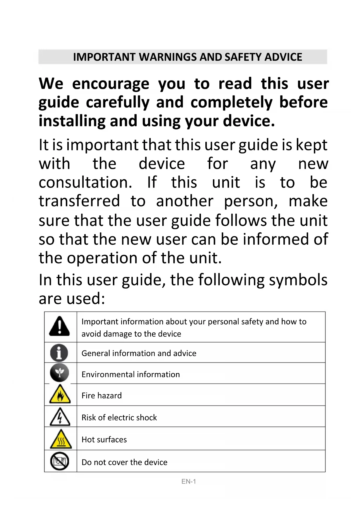 We encourage you to read this user guide carefully and completely before installing and using your device. It is important that this user guide is kept with the device for any new consultation. If this unit is to be transferred to another person, make sure that the user guide follows the unit so that the new user can be informed of the operation of the unit. In this user guide, the following symbols are used: